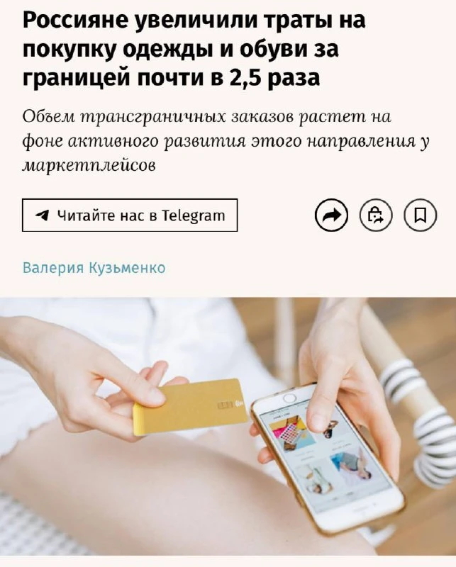 ⚡️ Россияне стали больше тратить на одежду и обувь из-за рубежа. По данным «Ведомостей», в прошлом году расходы на трансграничные заказы в этой категории составили 67,6 млрд рублей, что на 137% больше, чем годом ранее. Рост объясняют преодолением последствий санкций и активным развитием этого направления крупными маркетплейсами. Например, продажи одежды, обуви и аксессуаров через CDEK.Shopping выросли на 25%. @RetailBis