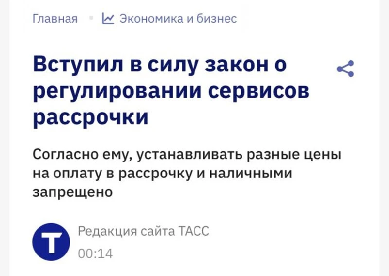 ⚡️ В России вступил в силу закон, запрещающий устанавливать разные цены при оплате наличными и в рассрочку. Исключения допускаются для договоров в рамках эксперимента по партнерскому финансированию и для сделок, связанных с долевым строительством.