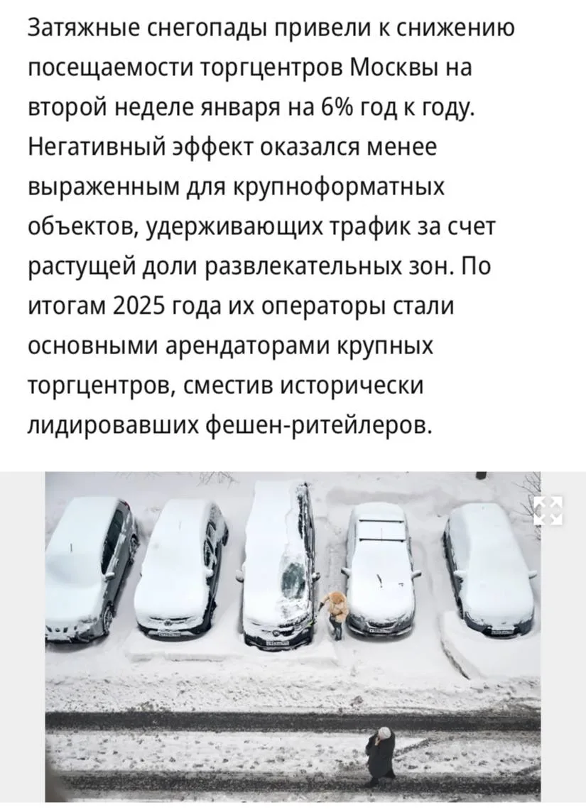 ⚡️ Затяжные снегопады в Москве привели к снижению посещаемости торговых центров. По данным издания, на второй неделе января этот показатель упал на 6% в годовом сравнении. Как отмечают эксперты, непогода также негативно сказалась на онлайн-торговле, поскольку ухудшение транспортной доступности замедляет работу служб доставки. @RetailBis