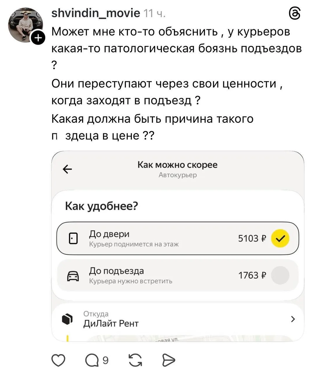 ⚡️ Курьеры предпочитают не заходить в подъезды из-за высокой разницы в оплате. Как отмечается, стоимость доставки непосредственно до двери квартиры может быть втрое выше, чем до подъезда, что и объясняет такое поведение. @RetailBis