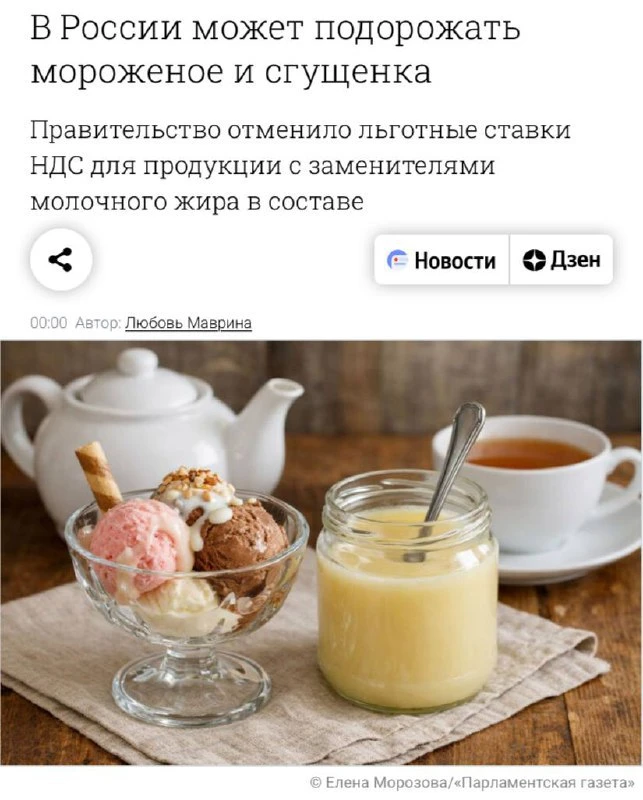 ⚡️ Мороженое и сгущенка могут подорожать в России из-за отмены льготного НДС. С 1 мая для молокосодержащих продуктов с заменителями молочного жира (спреды, сыры, соусы, некоторые виды мороженого и сгущёнки) отменяется льготная ставка НДС в 10%. Теперь она составит 22%.