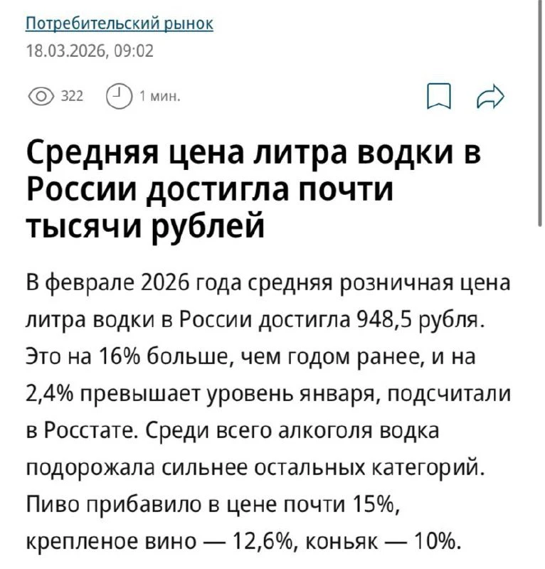 ⚡️ Средняя цена литра водки в России приблизилась к 1000 рублям. По данным «Коммерсантъ», в феврале стоимость крепкого алкоголя выросла на 16% в годовом выражении. Эксперты связывают рост с повышением акцизов, увеличением минимальной розничной цены, а также подорожанием логистики, сырья и упаковки. @RetailBis