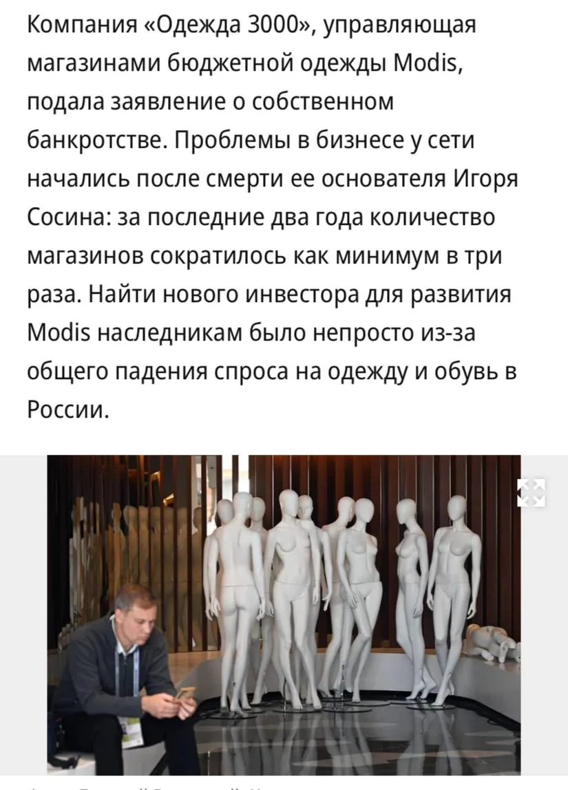 ⚡️ Компания «Одежда 3000», владеющая сетью магазинов Modis, подала на банкротство. По данным экспертов, это связано с высокой долговой нагрузкой и управленческими проблемами, возникшими после смерти основателя компании в 2020 году. @RetailBis