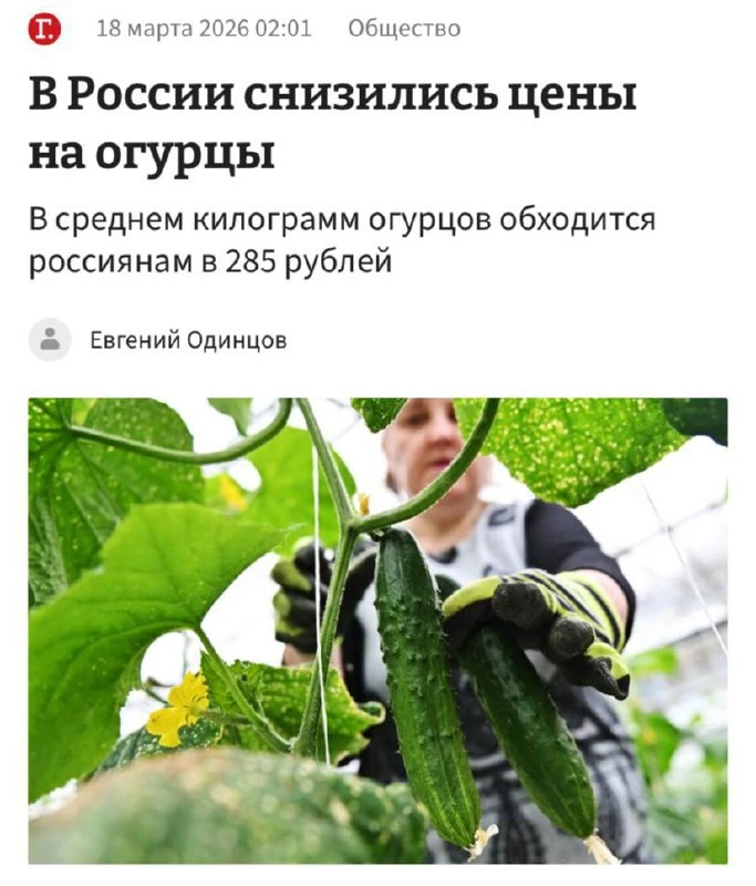 ⚡️ Цены на огурцы в России продолжают снижаться. По данным СМИ, за год они упали на 3,1%, а с начала 2026 года — на 2,4%. В среднем килограмм свежих огурцов сейчас стоит около 285 рублей. @RetailBis