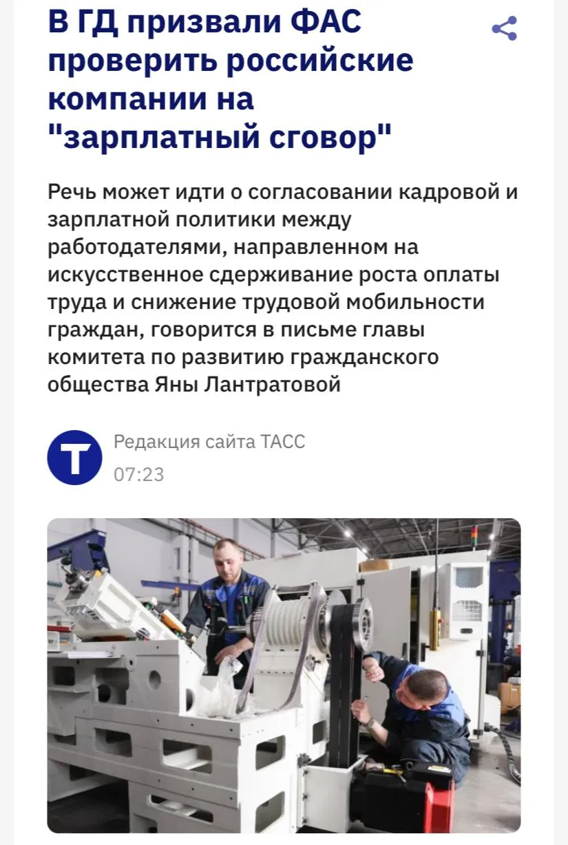 ⚡️ В Госдуме попросили ФАС проверить компании на «зарплатный сговор». С такой инициативой выступила депутат Яна Лантратова. По её мнению, некоторые работодатели могут согласовывать кадровую политику, чтобы искусственно сдерживать рост зарплат и ограничивать мобильность специалистов. Это ухудшает положение граждан и создаёт недобросовестные преимущества для компаний. @RetailBis