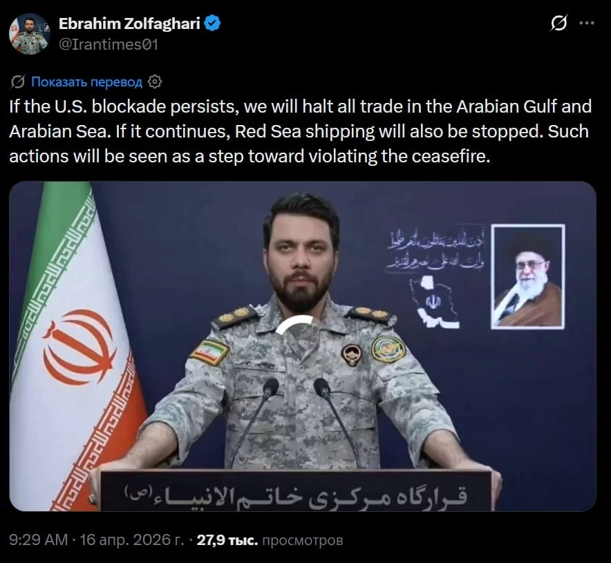 «Если блокада со стороны США продолжится, мы остановим всю торговлю в Персидском заливе и Аравийском море. Если она продолжится, будет остановлено и судоходство в Красном море. Такие действия будут расценены как шаг к нарушению режима прекращения огня».