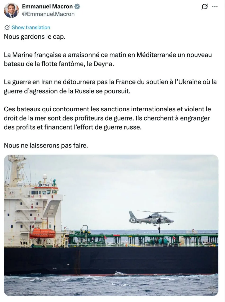 📸Президент Франции Эмманюэль Макрон заявлял, что танкер относится к «российскому теневому флоту».