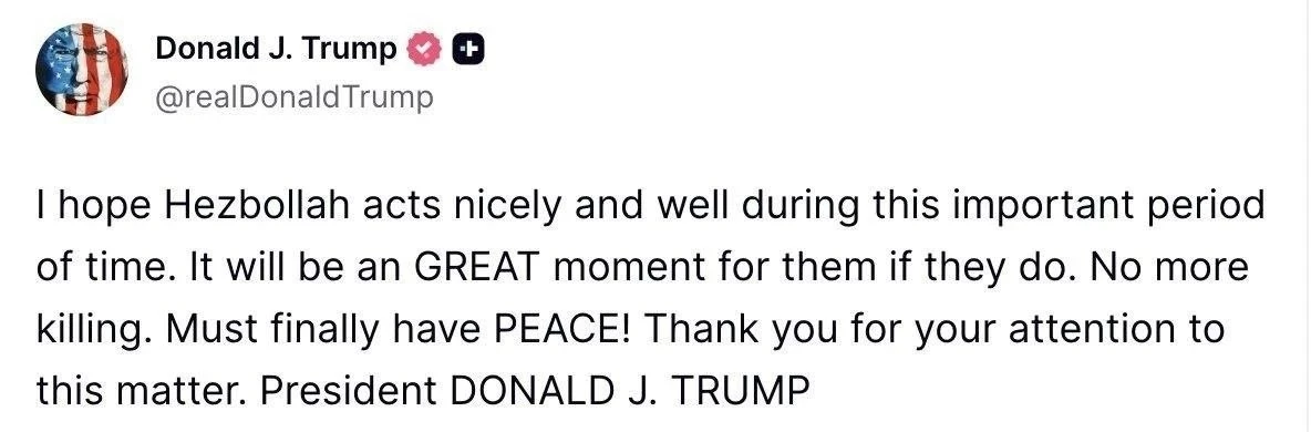 «Я надеюсь, что "Хезболла" будет вести себя хорошо и достойно в этот важный период времени. Это будет ЗАМЕЧАТЕЛЬНЫЙ момент для них, если они это сделают. Больше никаких убийств. Наконец должен наступить МИР! Спасибо за ваше внимание к этому вопросу».