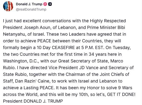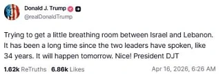«Пытаемся добиться небольшой передышки между Израилем и Ливаном. Лидеры этих стран не разговаривали уже давно — около 34 лет. Завтра это произойдёт. Отлично!».