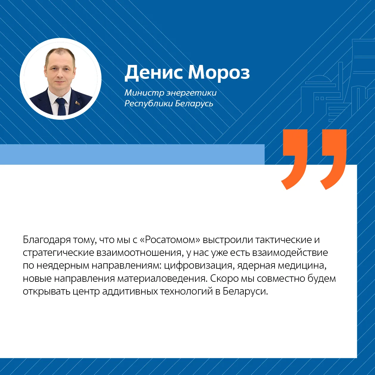 В рамках мероприятия подписан документ, расширяющий сотрудничество с Беларусью: стороны продолжают взаимодействие по вопросам эксплуатации Белорусской АЭС, переработки пестицидов и черной массы, а также по проектам в ядерной медицине, цифровизации, роботизации. Уделено внимание внедрению систем накопления энергии и развитию квантовых и смежных технологий.
