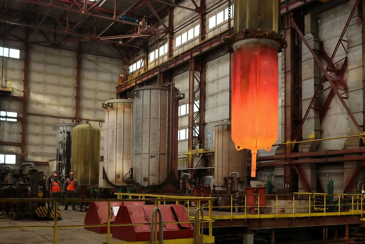 На заводе «АЭМ-Спецсталь» приступили к изготовлению корпуса реактора ВВЭР-ТОИ для третьего блока Курской АЭС‑2. 26 марта началась ковка первого 235‑тонного слитка. Специальную сталь для атомных реакторов сначала выплавляют в сверхмощной дуговой сталеплавильной печи вместимостью до 120 т. После того как металл проходит внепечную обработку и выдерживается в специальной вакуумной камере, чтобы дать жидкому сплаву кристаллизоваться и немного остыть, слиток отправляют на ковку. За процессом наблюдали журналисты.