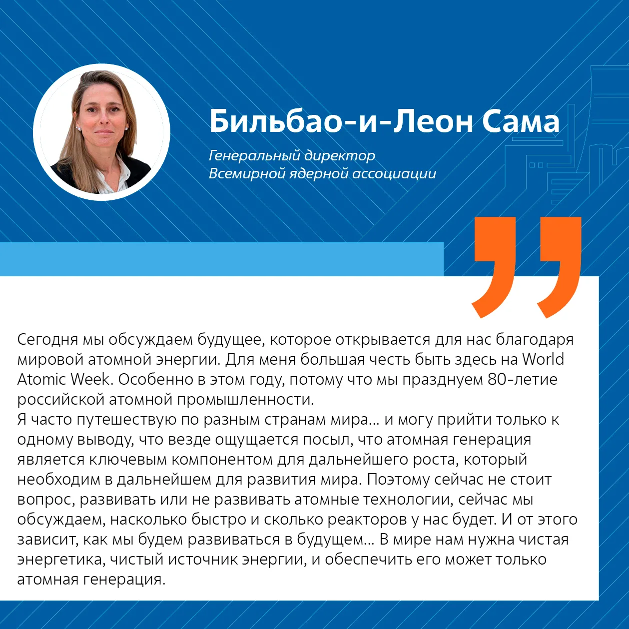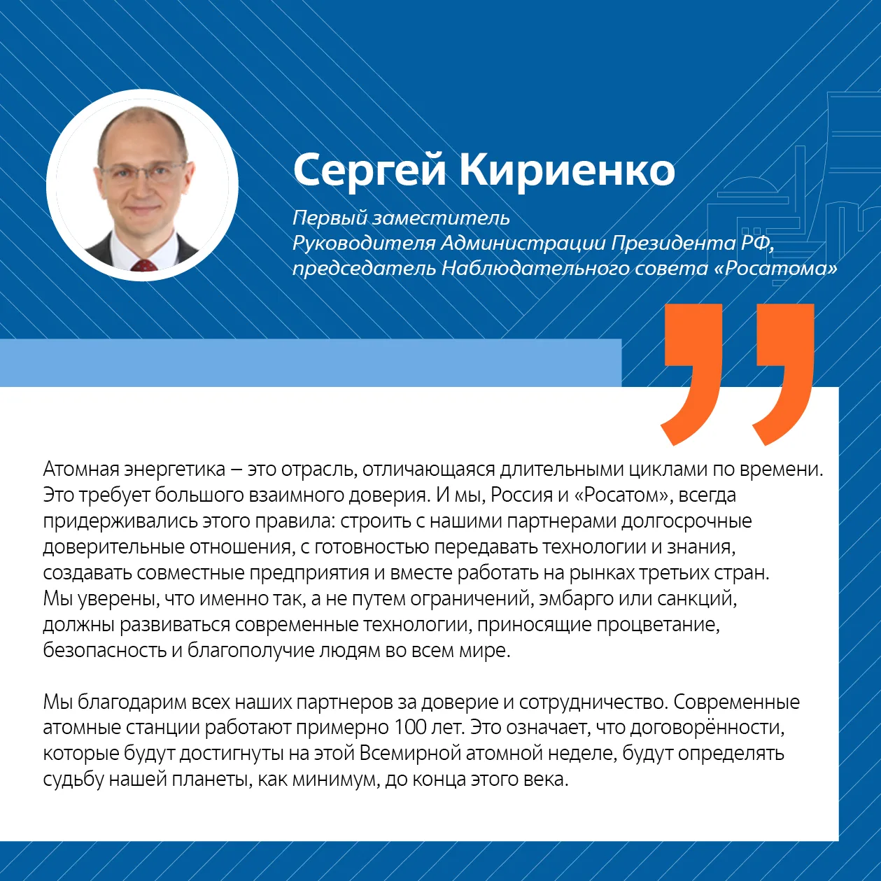 — Огромное удовольствие, большая честь и великая ответственность организовать дискуссию по развитию атомных технологий, формированию счастливого завтрашнего дня планеты здесь, в Москве, во время Мировой атомной недели. Многое из того, что будет здесь, будет впервые. Это и Глобальный атомный форум, и развитие партнерских атомных отношений в рамках БРИКС, и большая молодежная программа. Наша задача — вместе шагнуть в завтрашний день, где нет альтернативы использованию атомной энергии как основы зеленой энергетики. И мы от всей души благодарим наших партнеров за доверие. И сделаем все, чтобы это доверие оправдать. Мы объявляем Мировую атомную неделю открытой!