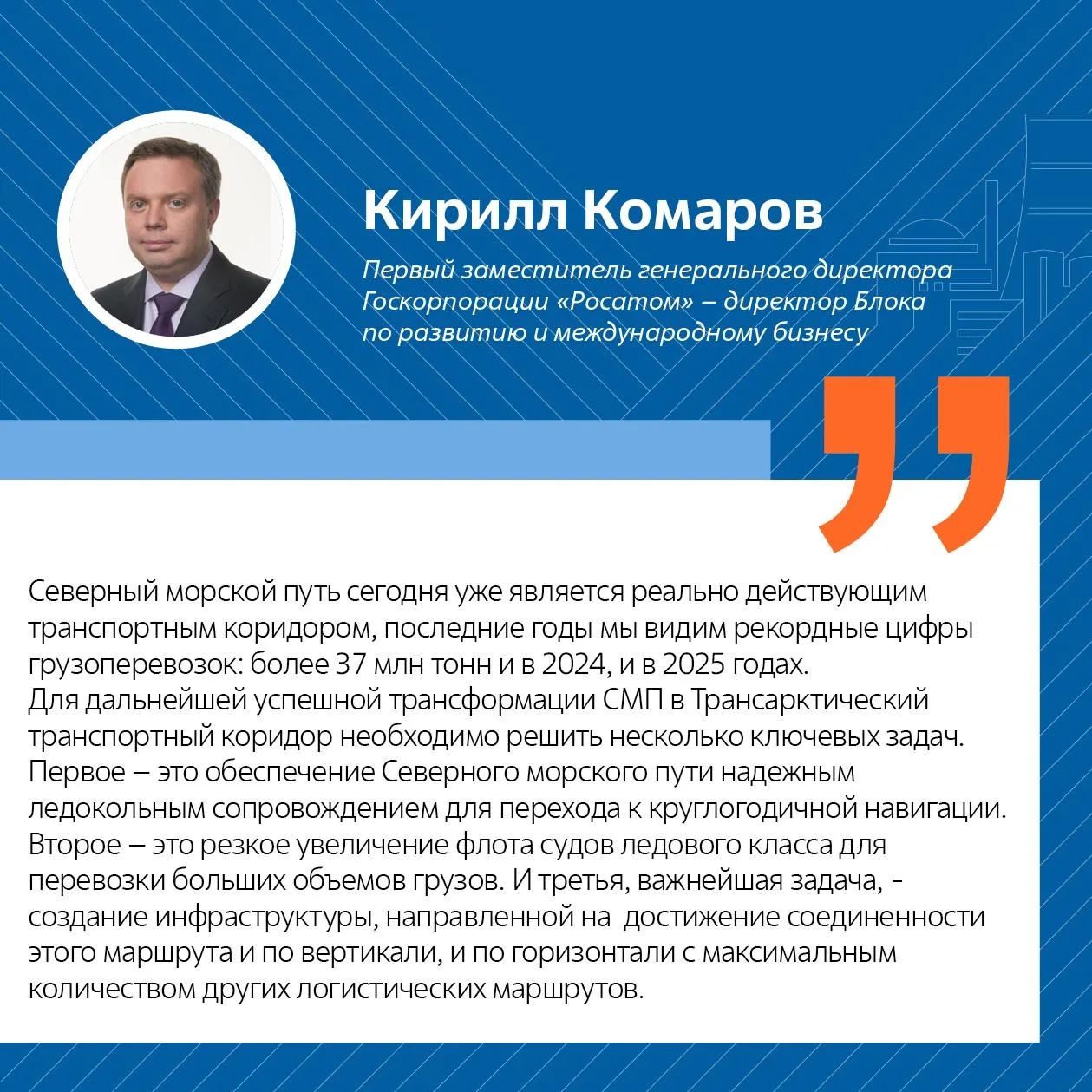 - СМП обладает колоссальным потенциалом как благодаря богатейшим ресурсным месторождениям, так и возможности перехода к круглогодичной навигации. Госкорпорация обладая уникальным атомным ледокольным флотом, готова обеспечить надёжное и, главное, безопасное транспортное сообщение по всему арктическому побережью, соединяя Азию и Европу.