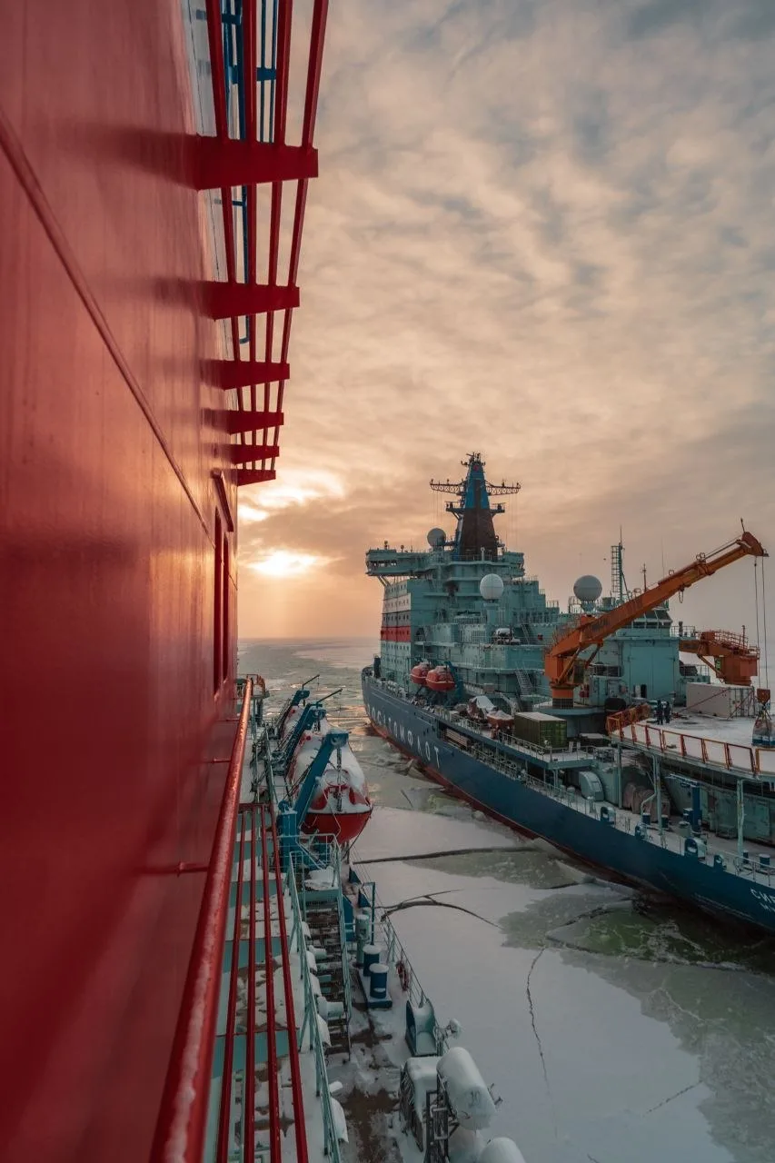 Стыковка универсальных атомных ледоколов «Якутия» и «Сибирь» в Карском море.