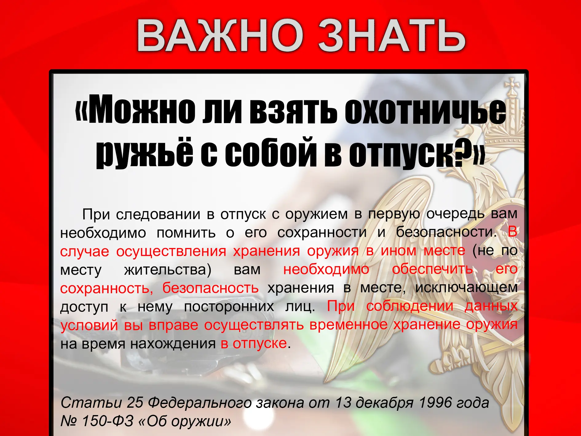 Оперативные уведомления о ключевых событиях страны и региона, эксклюзивные материалы о работе подразделений Росгвардии, полезные инструкции и информация об изменениях оружейного законодательства, интересные факты и многое другое.
