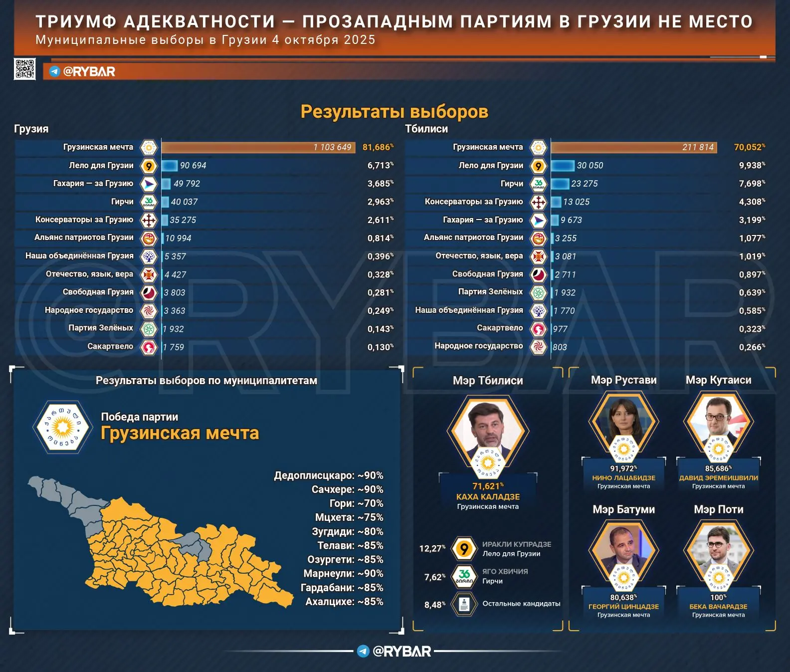 ▪️Все 5 мэров самоуправляющихся городов — представители «Грузинской мечты»: в Тбилиси — Каха Каладзе (71,55%), в Батуми — Гиорги Цинцадзе (80,55%), в Кутаиси — Давит Еремеишвили (85,62%), в Поти — Бека Вачарадзе (100%), а Рустави — Нино Лацабидзе (91,9%).