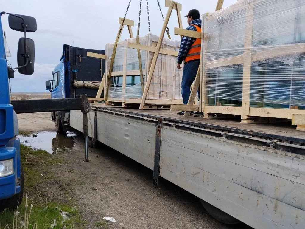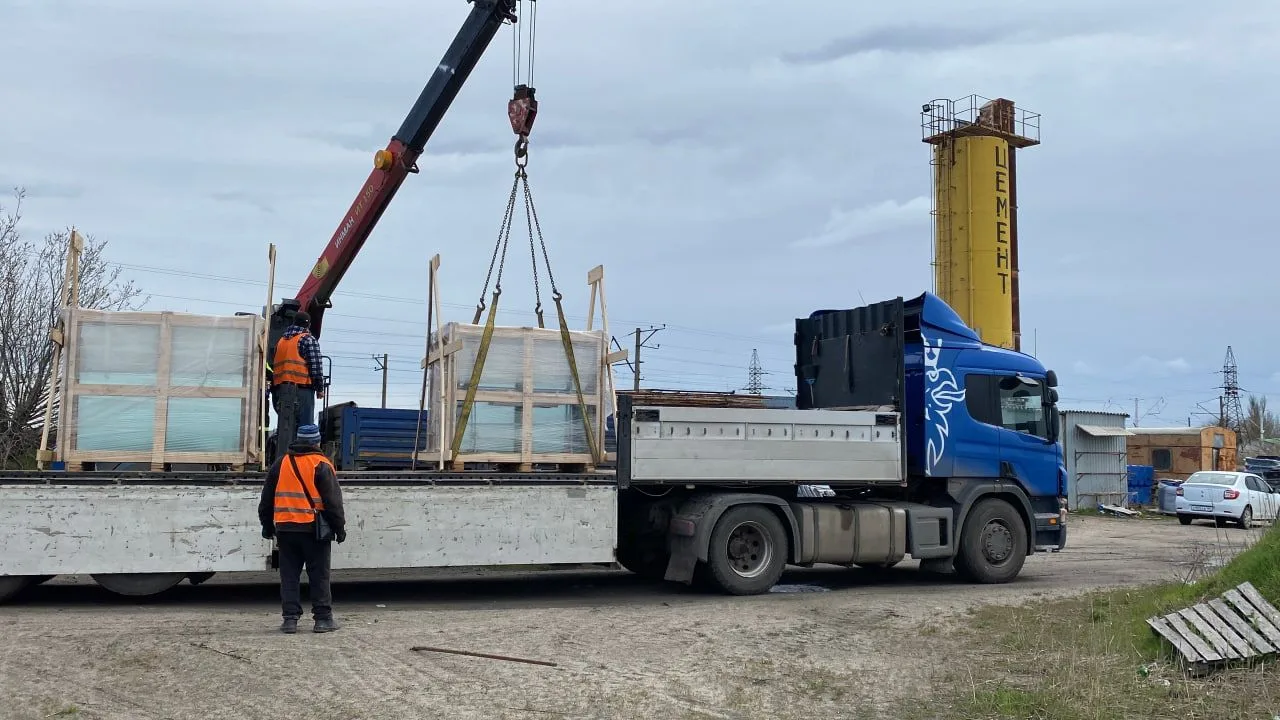 Это около тысячи м² — всё пойдёт на восстановление домов, где после обстрелов выбиты окна. О такой поддержке договаривались заранее, и коллеги слово сдержали.