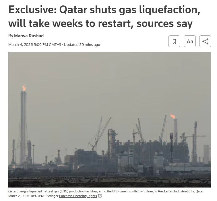 ⚡️Катар прекращает сжижение СПГ на заводе в Рас-Лаффане, объявив форс-мажор в отношении экспорта. Возобновление производства займет не менее двух недель, а еще две недели потребуются для выхода на полную мощность.