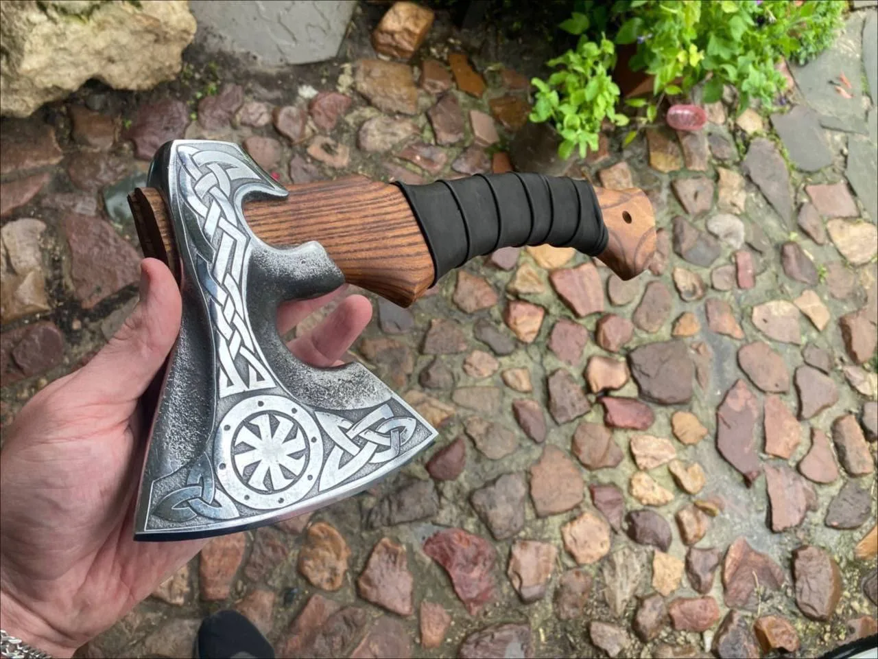 За основу взят кованный металл 9XC. Устойчив к сколам, не боится воды, прослужит не один год.