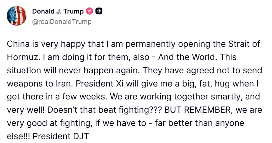 Китай очень рад, что я навсегда открываю Ормузский пролив. Я делаю это и для них, а также — для всего мира. Подобная ситуация больше никогда не повторится. Они согласились не отправлять оружие в Иран. Президент Си крепко-крепко меня обнимет, когда я приеду туда через несколько недель. Мы грамотно и очень успешно сотрудничаем! Разве это не лучше, чем воевать??? НО ПОМНИТЕ: если придётся, мы умеем воевать — и гораздо лучше, чем кто‑либо ещё!!!