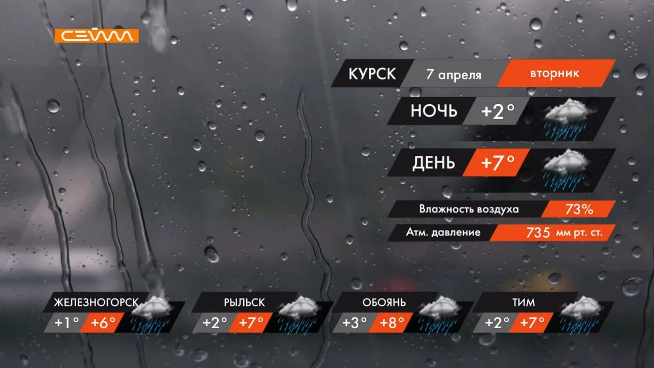 Завтра, 7 апреля, в Курске будет облачно, днем с прояснениями. Ночью и днём осадки, местами сильные в виде дождя и мокрого снега. В отдельных районах грозы.
