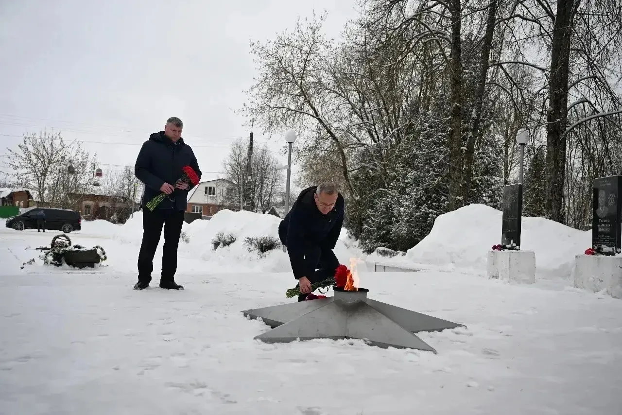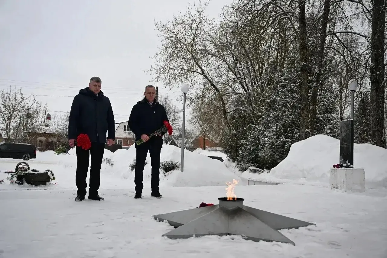 Рабочую поездку в Дзержинский район начал с возложения цветов к вечному огню на мемориале «Журавли» в Кондрово.