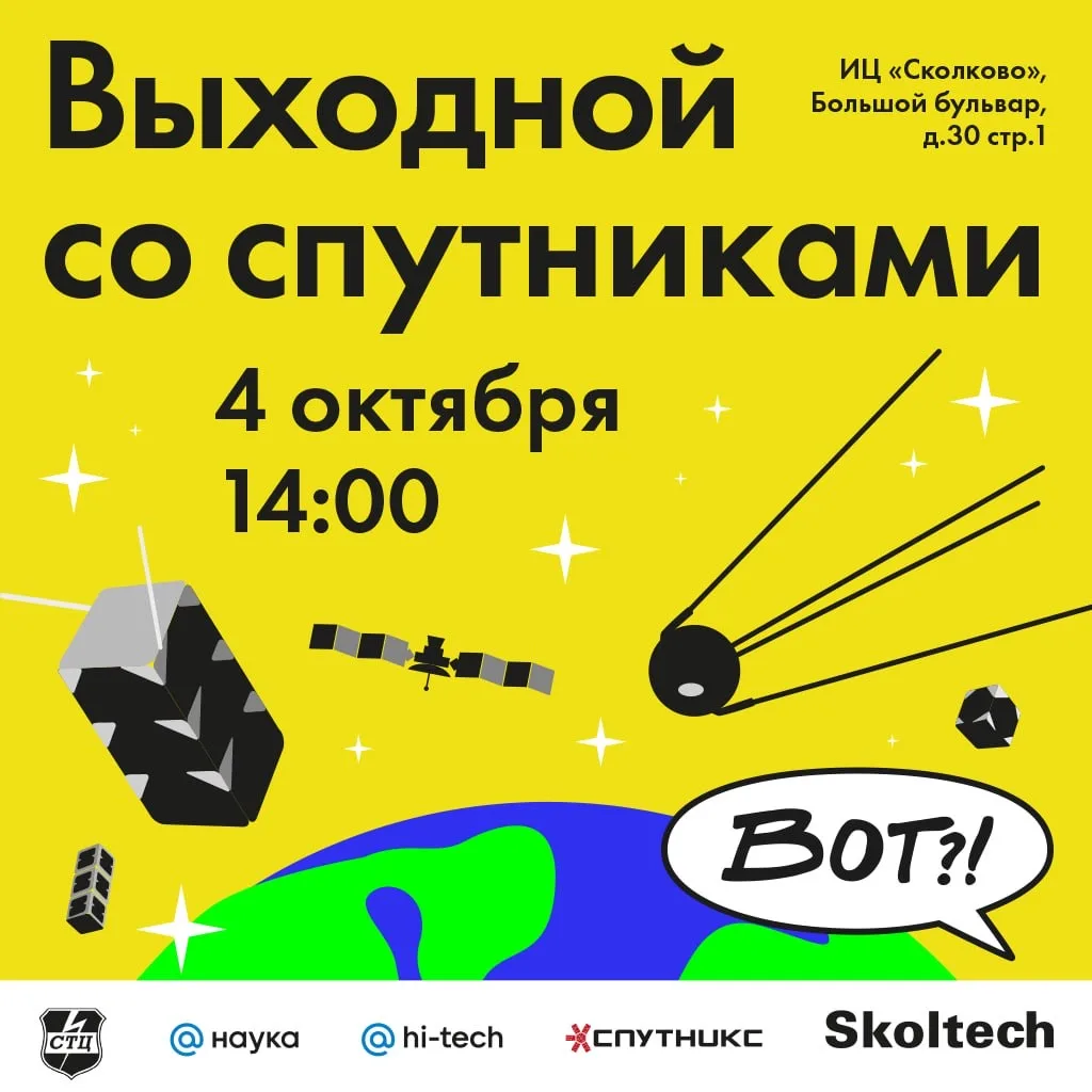 4 октября вместе с учёными Сколтеха организуем большой научный праздник — «Выходной со спутниками». В программе: лекция о кубсатах, космические мастер-классы для детей от 8 лет и старше, фотовыставка снимков с орбиты Земли, демозона со спутниками в натуральную величину и небольшое крио-шоу.