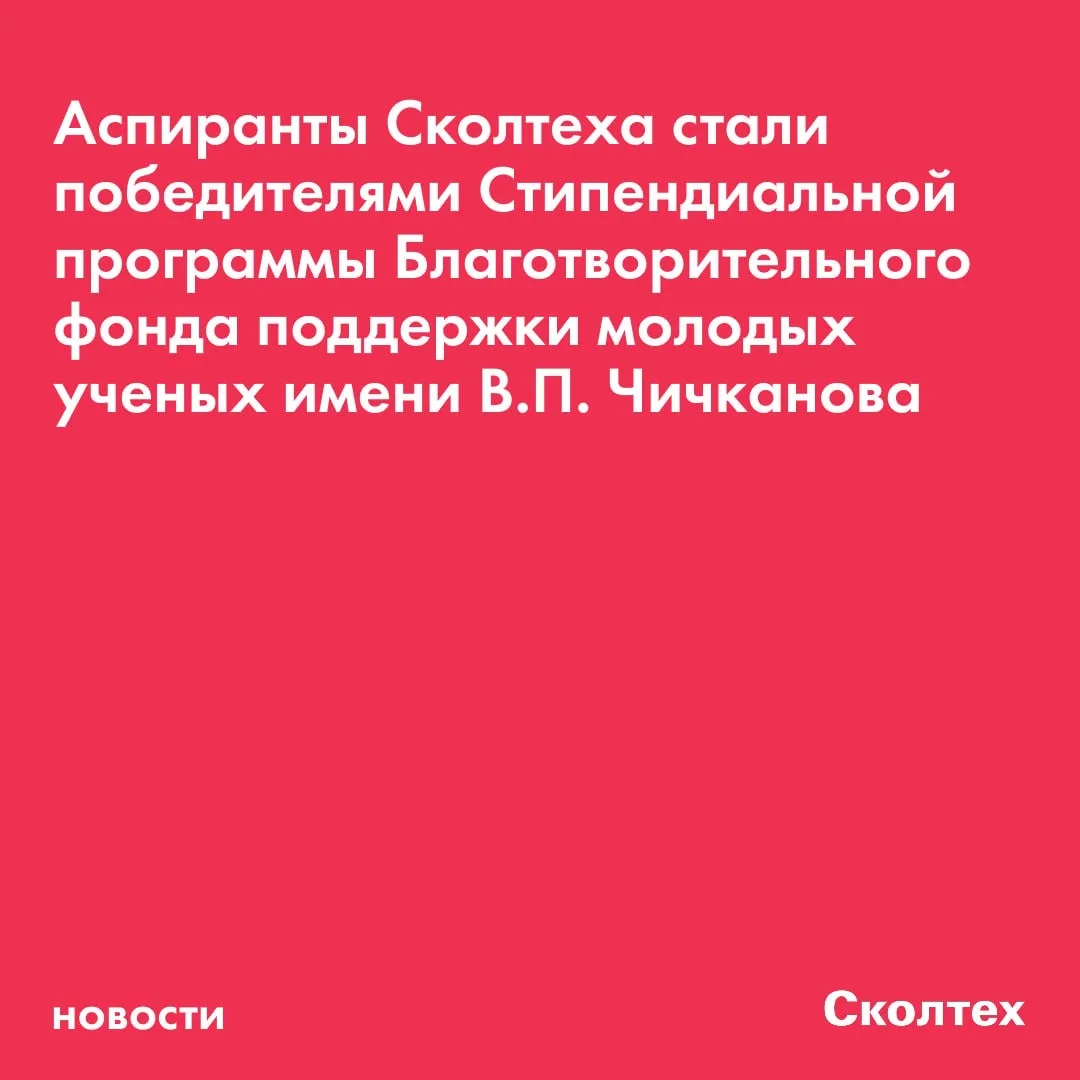 Трое аспирантов Сколтеха стали победителями Стипендиальной программы Благотворительного фонда поддержки молодых ученых имени В.П. Чичканова!