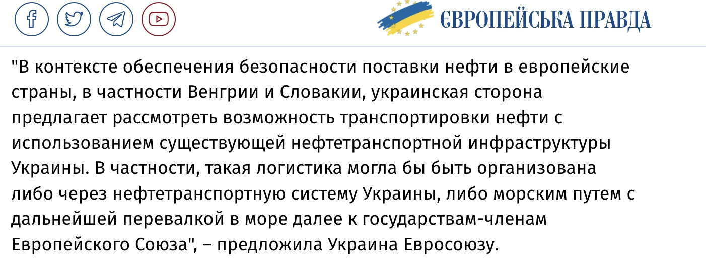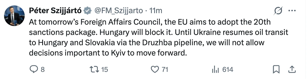 «На завтрашнем заседании Совета ЕС по иностранным делам Евросоюз намерен принять 20-й пакет санкций. Венгрия его заблокирует. Пока Украина не возобновит транзит нефти в Венгрию и Словакию по трубопроводу «Дружба», мы не позволим продвигать решения, важные для Киева».