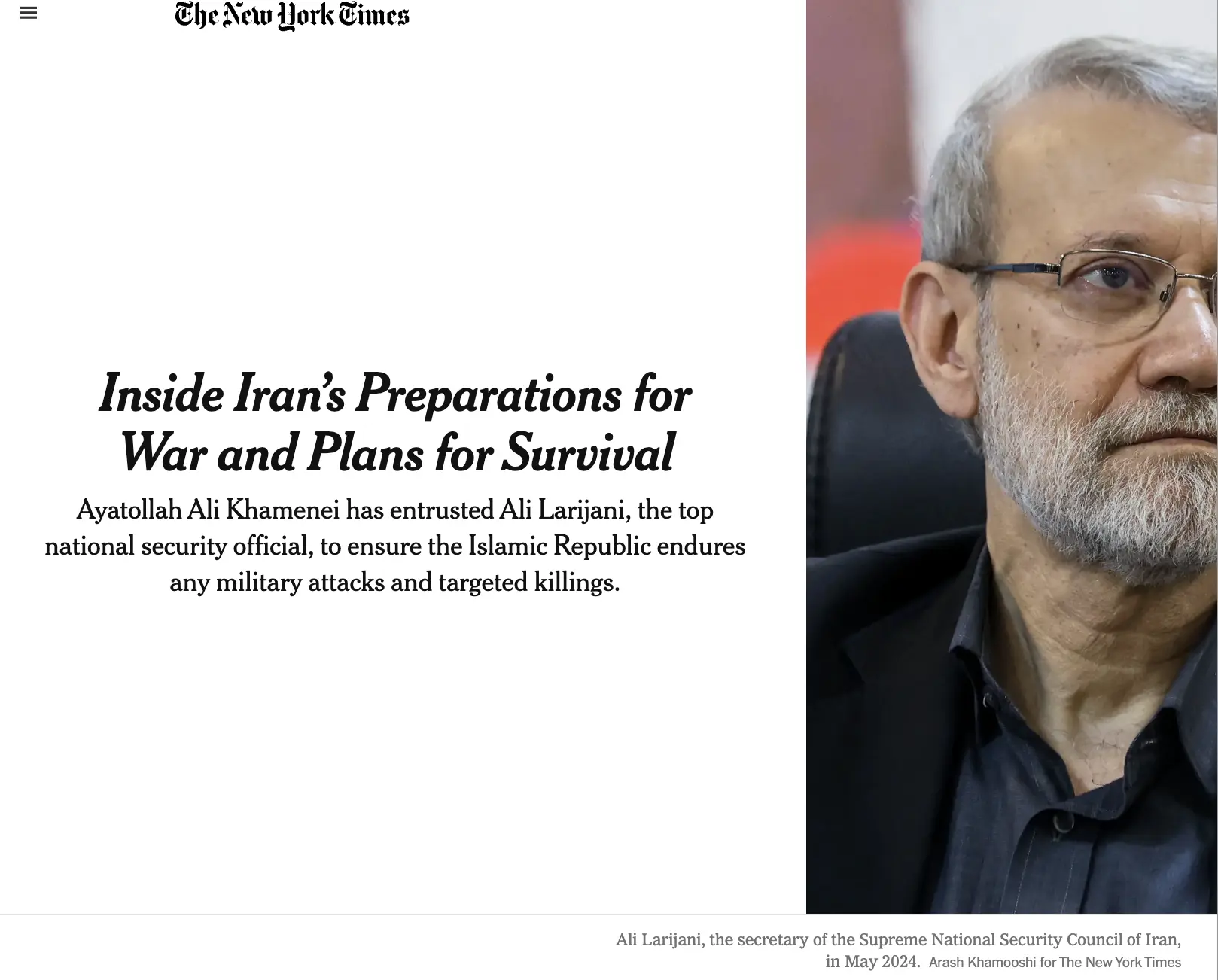 «По словам источников, Хаменеи поручил Лариджани и нескольким ближайшим политическим и военным союзникам обеспечить выживание системы не только в случае американских или израильских бомбардировок, но и возможных покушений на руководство страны, включая самого верховного лидера. Хаменеи полностью доверяет Лариджани и считает его подходящим человеком для нынешнего кризиса. Он считает, что именно он подходит для этого сложного момента благодаря своему политическому опыту, острому уму и знаниям. Его роль будет очень заметной во время войны.