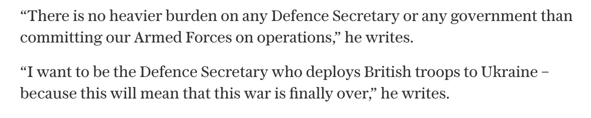 «Я хочу стать тем министром обороны, который отправит британские войска на Украину» — глава Минобороны Британии поведал о своих влажных мечтах в интервью Telegraph.