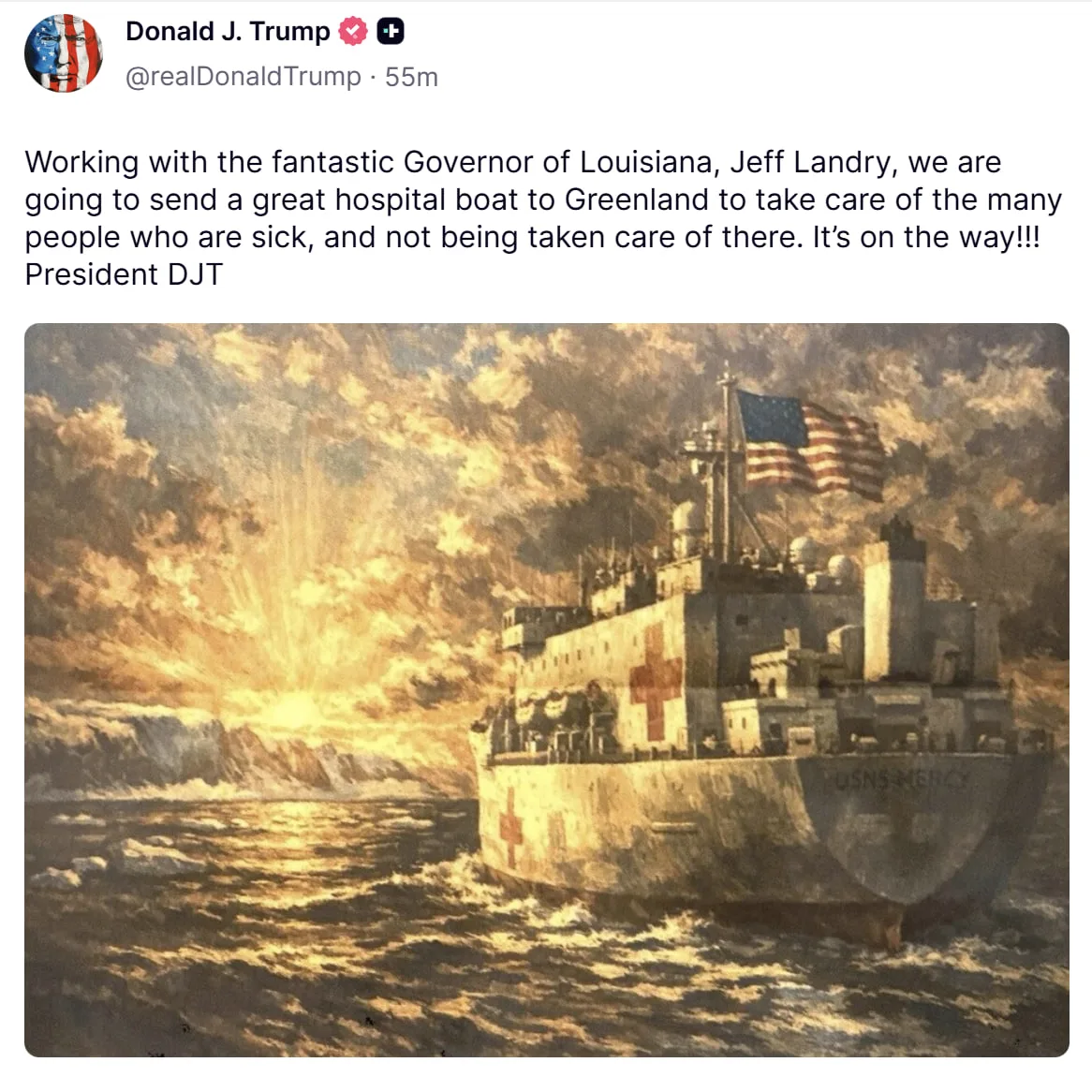 Дональд Трамп в соцсети Truth Social заявил, что США направят медицинское судно к Гренландии для оказания медпомощи местным жителям.