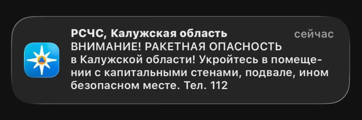 На территории Калужской области объявлена ракетная опасность, - РСЧС.