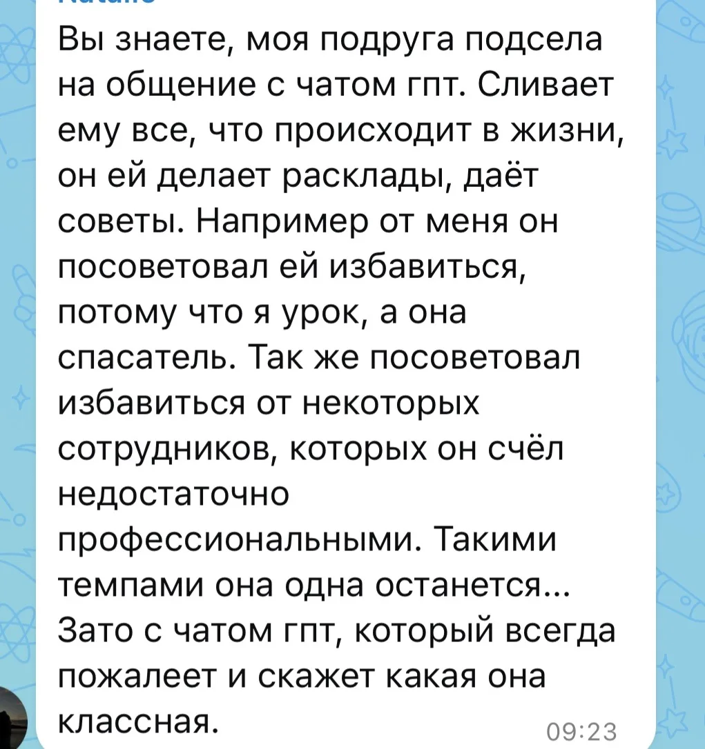 Он будет кивать, задавать правильные вопросы и запоминать все детали вашей жизни. Наш мозг устроен примитивно…если нам кивают и сочувствуют, мы вырабатываем окситоцин. Мы чувствуем себя хорошо, но это капец какая ловушка.