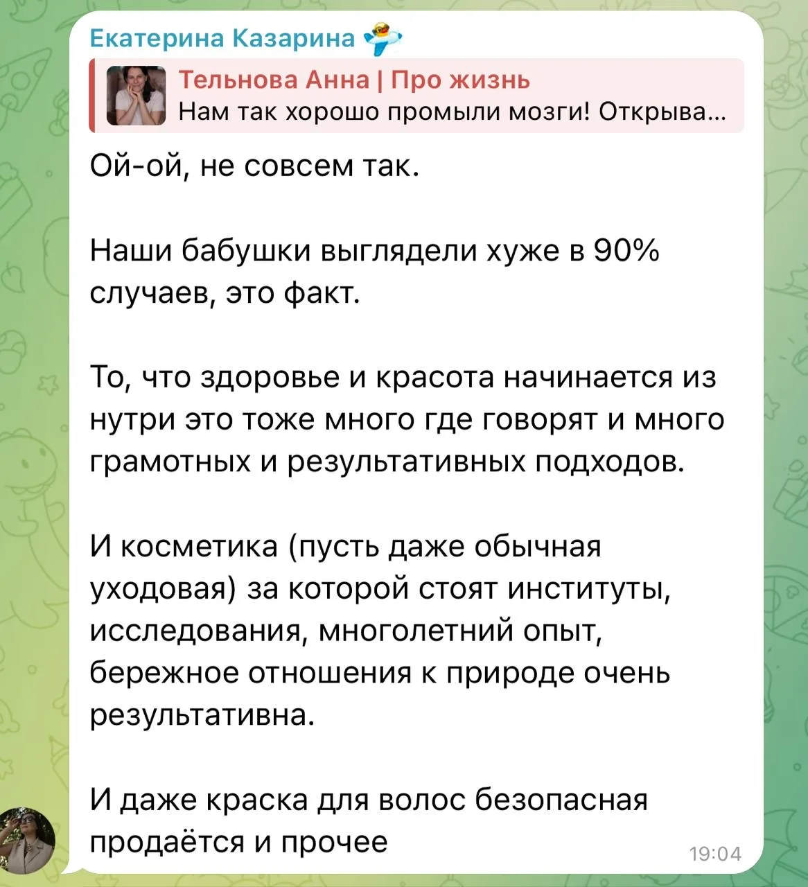 Сейчас же нас убедили, что мы «недостаточно хороши» в оригинале. Что старение — это катастрофа, которую нужно срочно залить кислотой.
