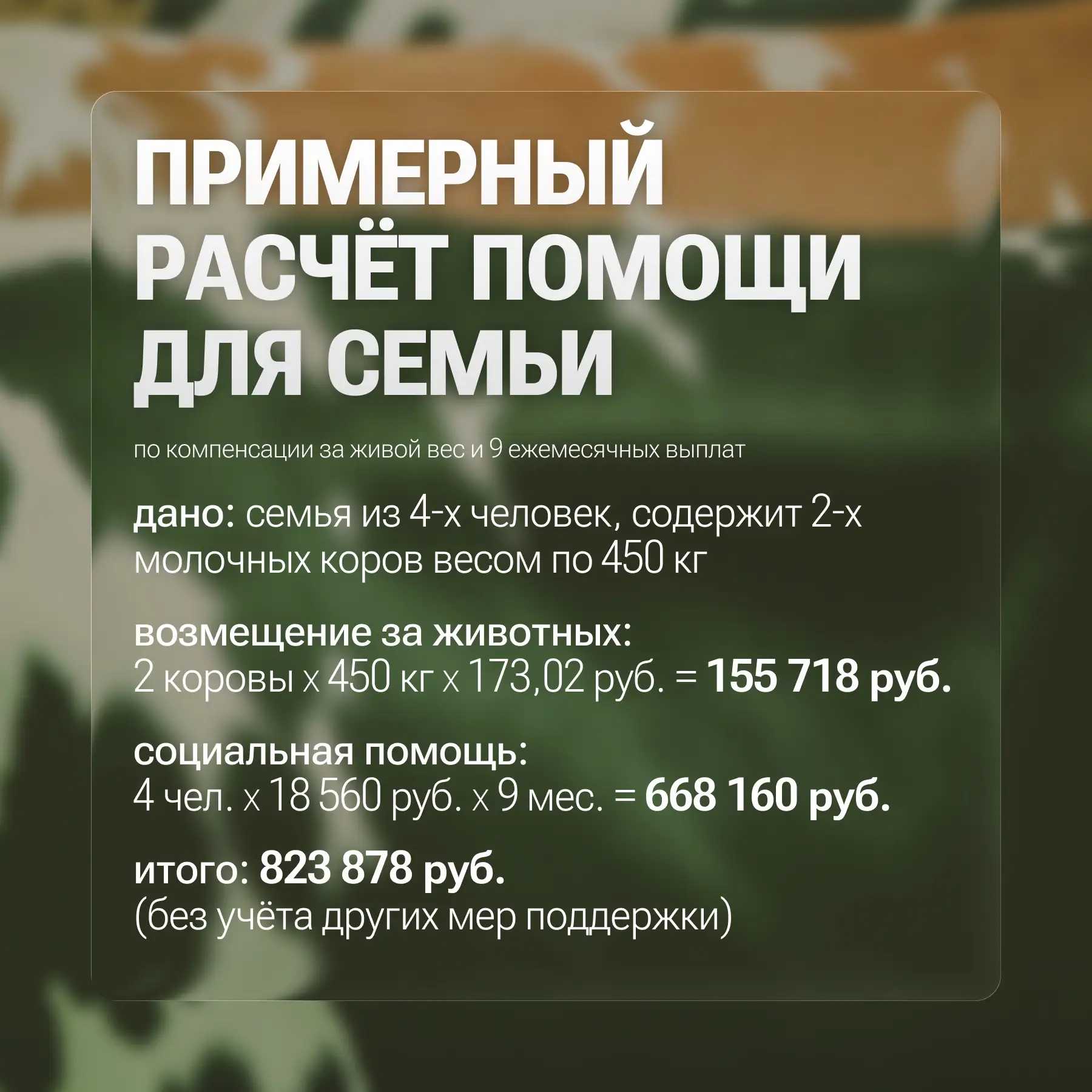Приведу конкретный пример. Сегодня перечислены средства одной из семей, состоящей из пяти человек: отец, мать, двое детей и проживающая с ними бабушка. Выплата за изъятый скот – это пять коров, три свиньи и четыре козы – составила 647 000 рублей. Кроме этого, семья получила выплату в связи с утратой семейного дохода в размере 92 800 рублей за первый месяц. За весь период действия данной меры, сумма поддержки составит 835 200 рублей. Также, в случае принятия решения о восстановлении личного хозяйства, семья сможет получить компенсацию в размере 50% от расходов на приобретение молодняка.