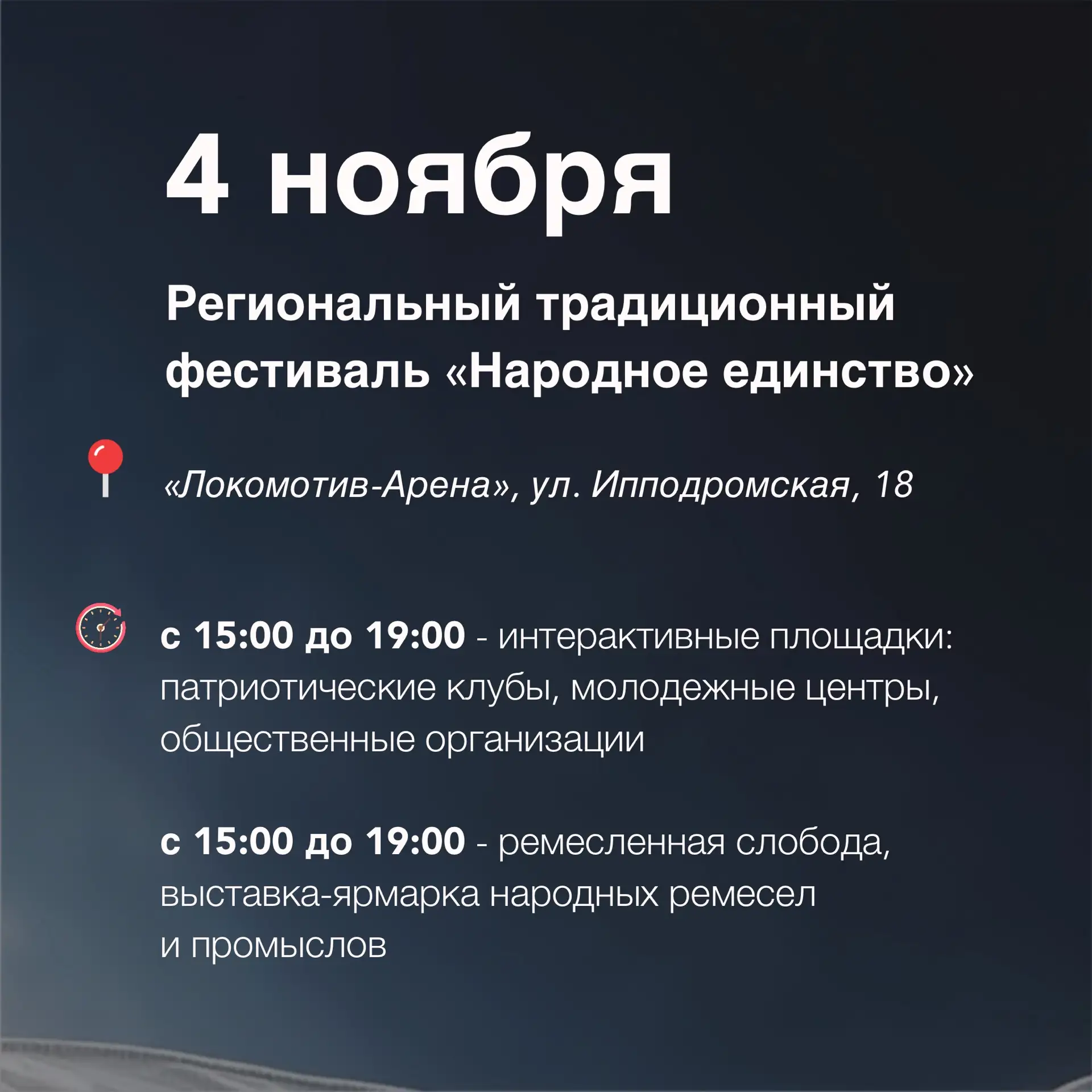 Федерация хоккея России подготовила для жителей и гостей нашего города насыщенную программу, чтобы каждый посетитель почувствовал настоящий хоккейный праздник: матчи сборных России против Беларуси и Казахстана, турнир по хоккею 3х3, выставочный матч по адаптивному хоккею «Хоккей для всех», международный детский турнир «Кубок Первого канала. Дети». Также болельщиков ждет мастер-шоу с участием сборной России, где хоккеисты продемонстрируют исключительное мастерство, оригинальные упражнения и элементы индивидуальной техники.