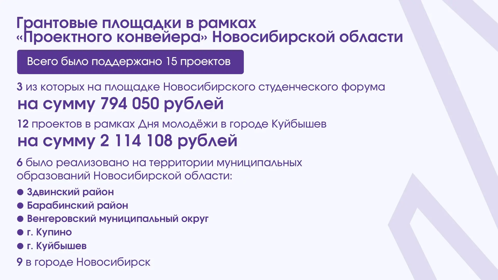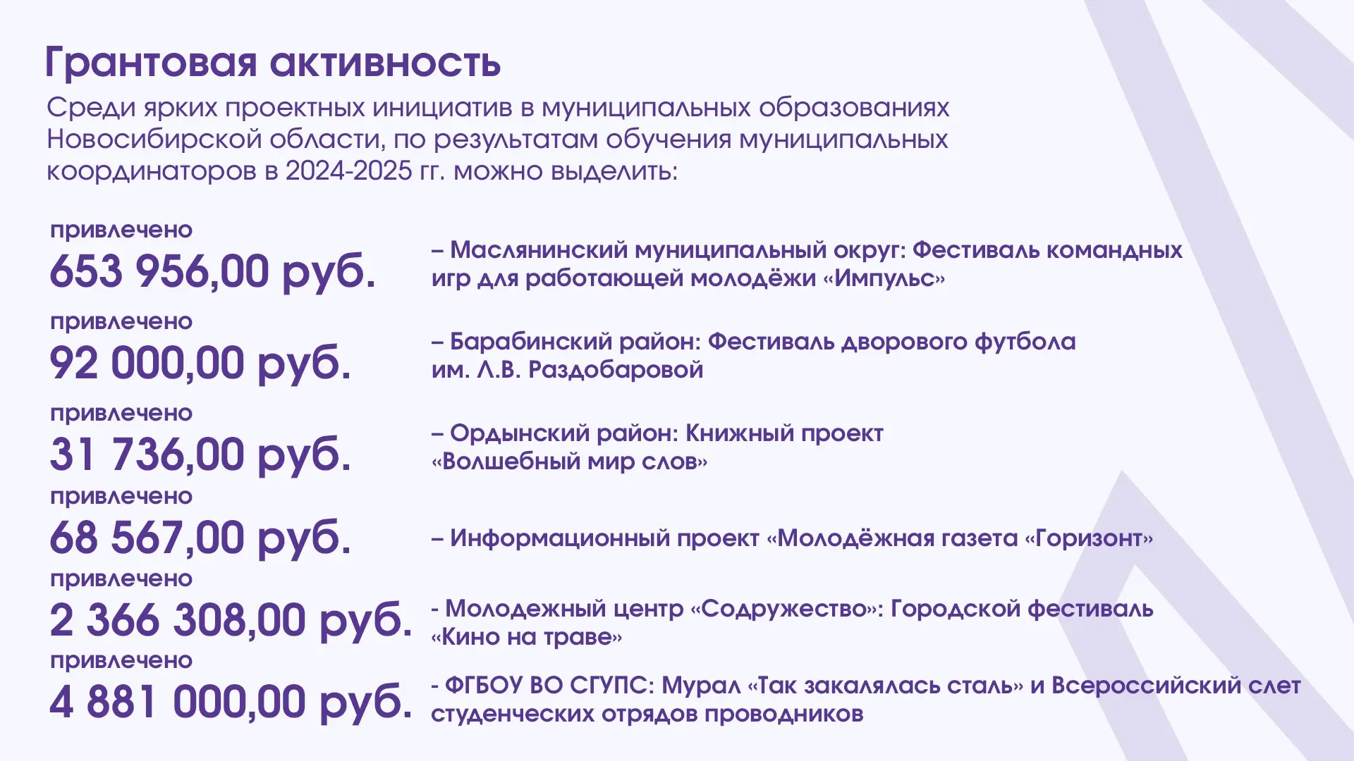 Важно отметить, что увеличивается объем федеральной грантовой поддержки – в 2025 году в регион было привлечено порядка 70 млн рублей на реализацию 40 молодежных проектов. Подать заявку на конкурс «Росмолодежь.Гранты», который проводится в рамках нацпроекта «Молодежь и дети», можно до 15 апреля. В прошлом году федеральные гранты в рамках конкурса получили двое молодых людей из Новосибирской области: Константин Цигулев с проектом «Образовательная программа «Безопасное детство» и Мария Рыжанкова с проектом «Умревинский острог – место зарождения Новосибирской области».
