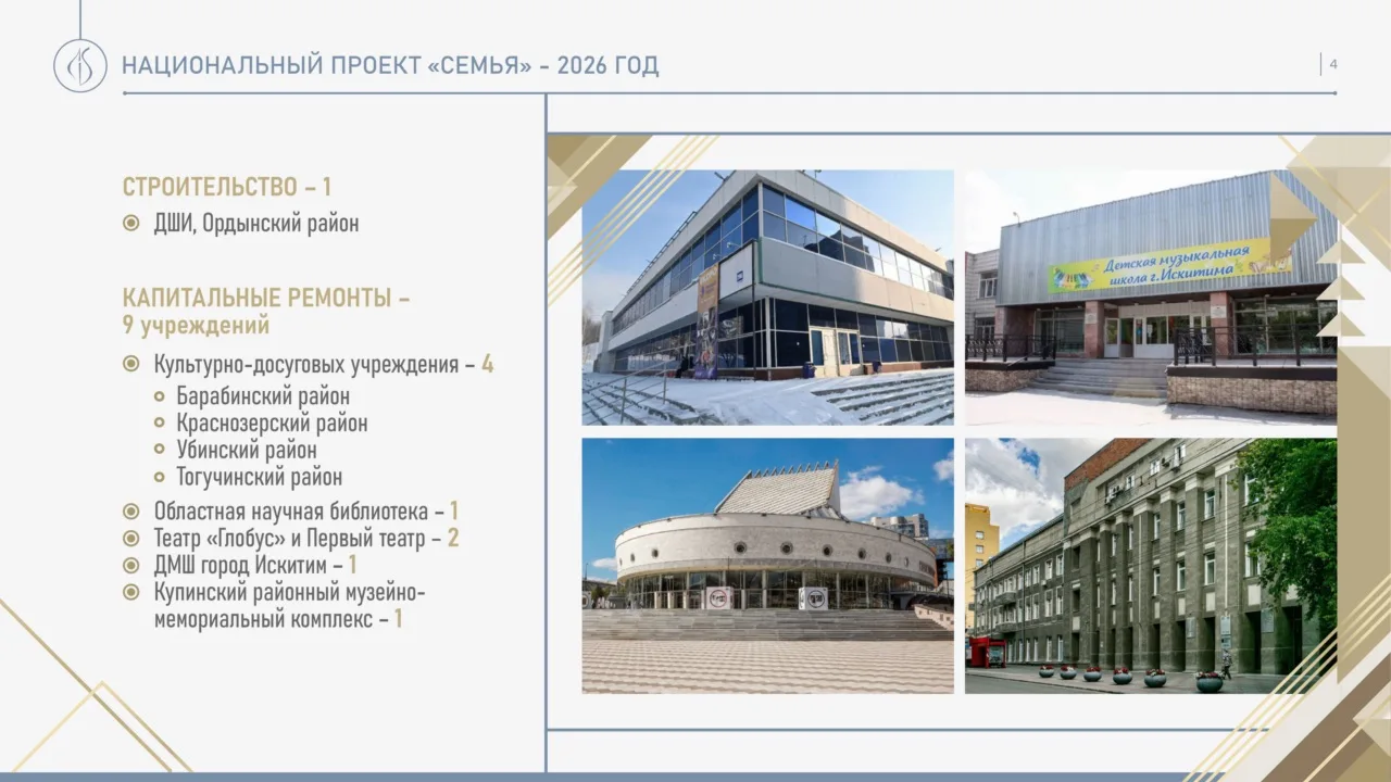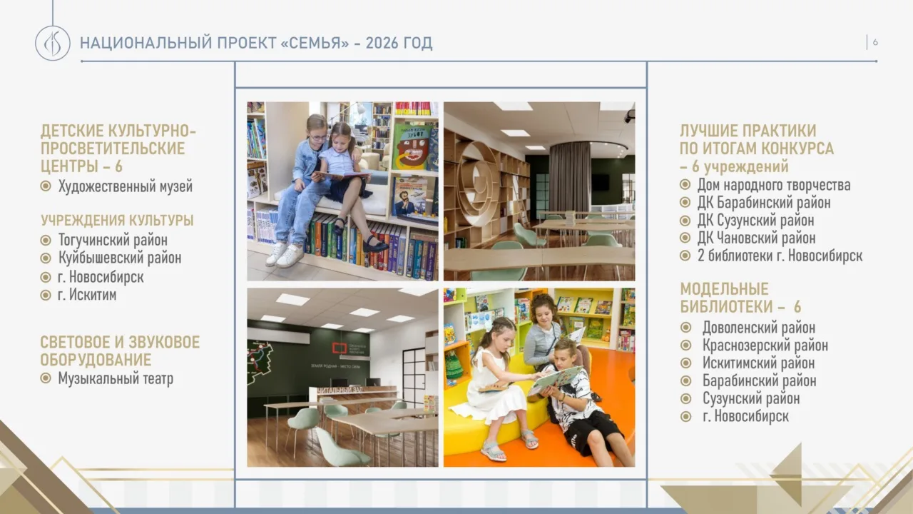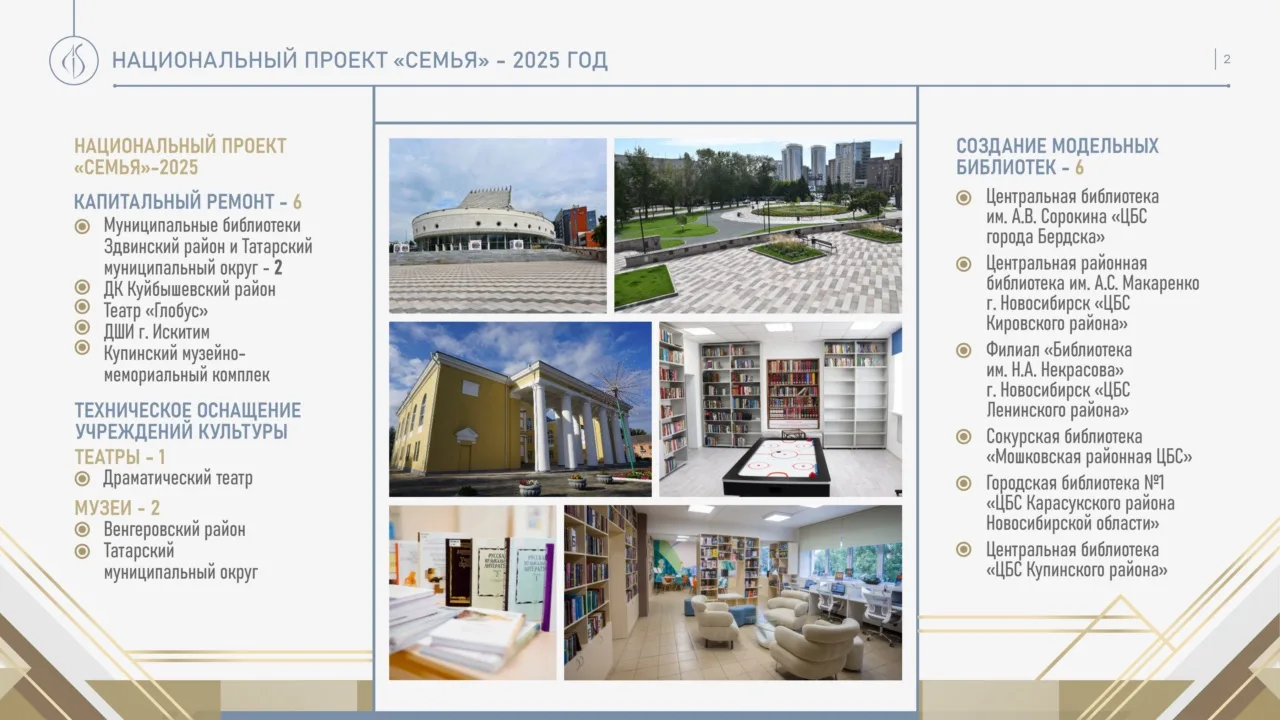 Наш регион активно участвует в федеральных проектах и программах, превращая культурные инициативы в реальные преобразования. В прошлом году в рамках нацпроекта «Семья» проведен капремонт двух муниципальных библиотек в Здвинском районе и Татарском муниципальном округе, обновлены здания Культурно-досугового комплекса в Куйбышеве, Новосибирского академического молодежного театра «Глобус», Детской музыкальной школы Искитима и Купинского районного музейно-мемориального комплекса. Продолжилась работа по оснащению музеев и театров, а также по переоснащению муниципальных библиотек.