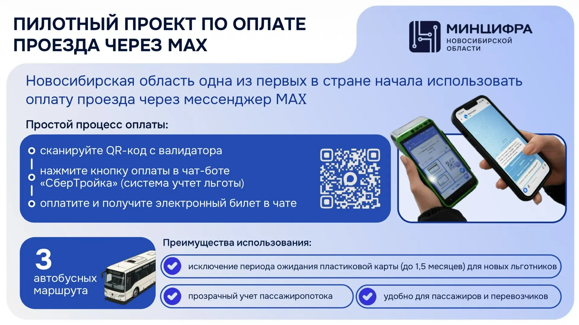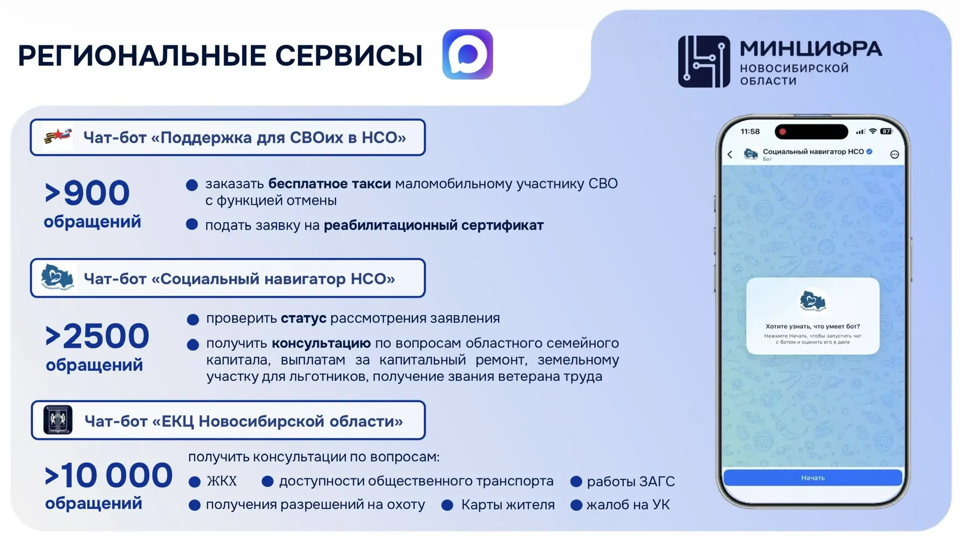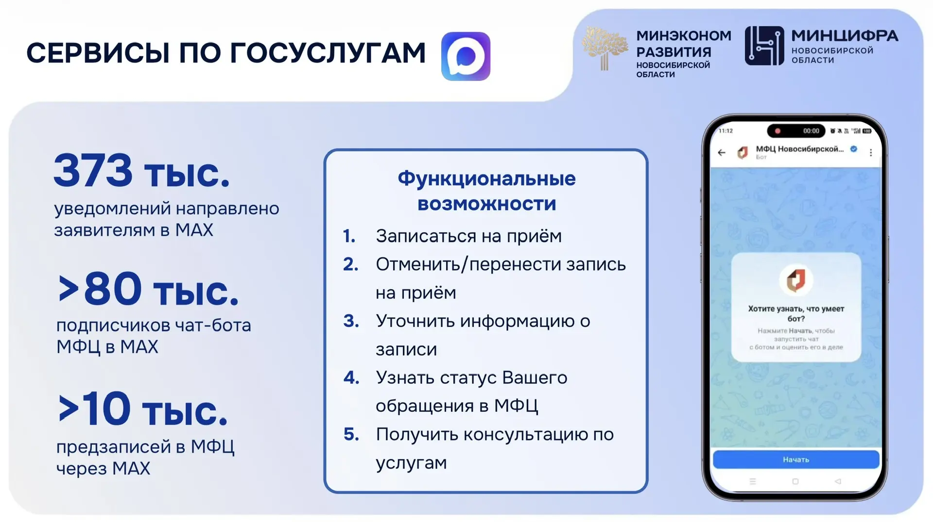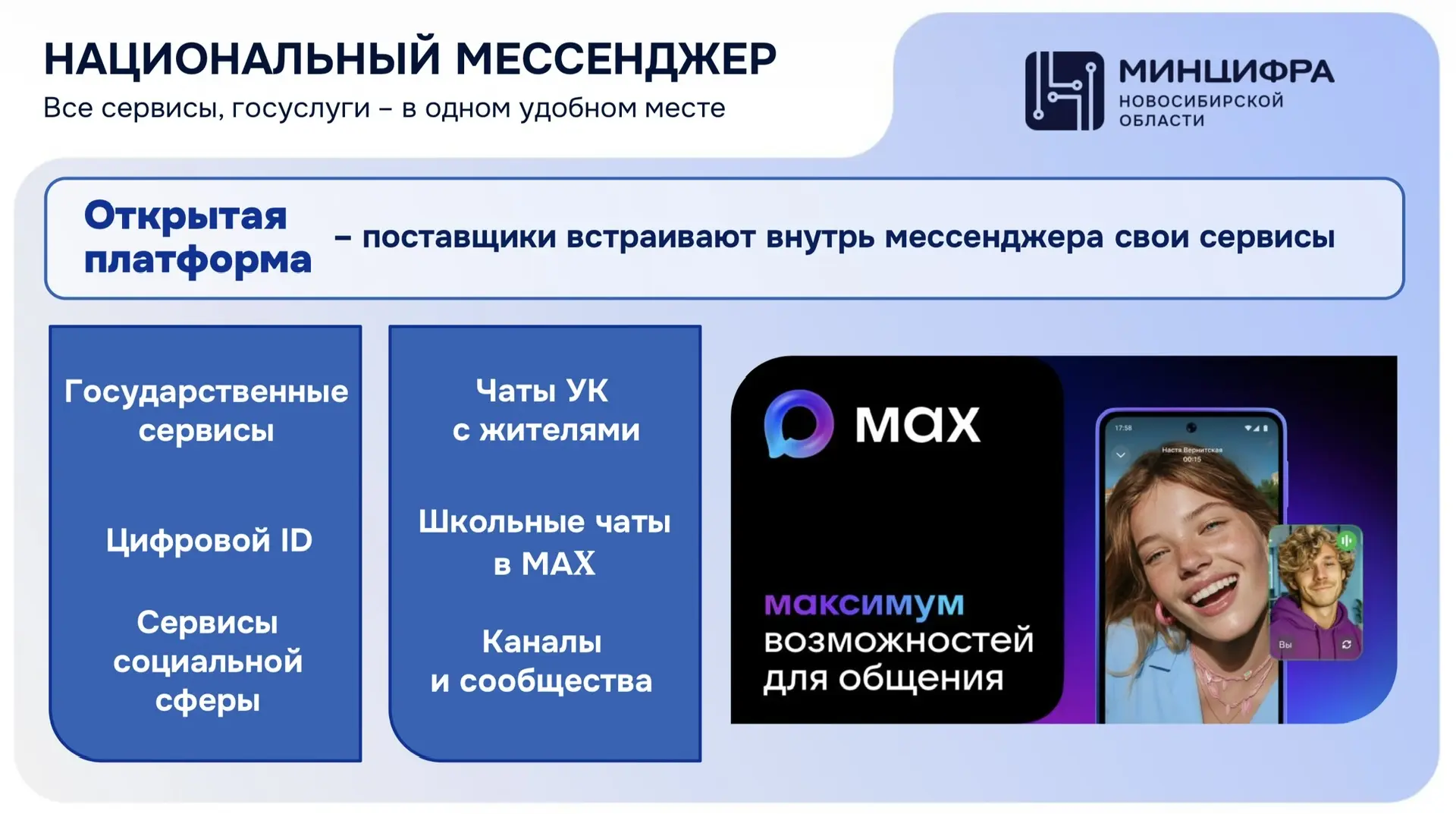 Для удобства получения жителями Новосибирской области услуг в электронном виде мы создали ряд полезных региональных сервисов на базе МАХ. Интеграция с региональными информационными системами позволяет предоставлять широкий спектр образовательных, социальных и коммунальных сервисов прямо внутри мессенджера. Региональные сервисы на базе МАХ делают получение государственных и муниципальных услуг максимально быстрым и доступным. Теперь, чтобы записаться к врачу, получить напоминание об оплате услуг ЖКХ, оформить справки или записаться в МФЦ – достаточно открыть мессенджер и выбрать нужную услугу. Это позволяет исключить необходимость поездок в различные ведомства, очередей и бумажной волокиты.