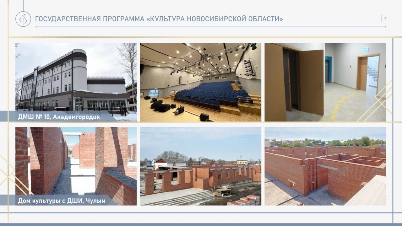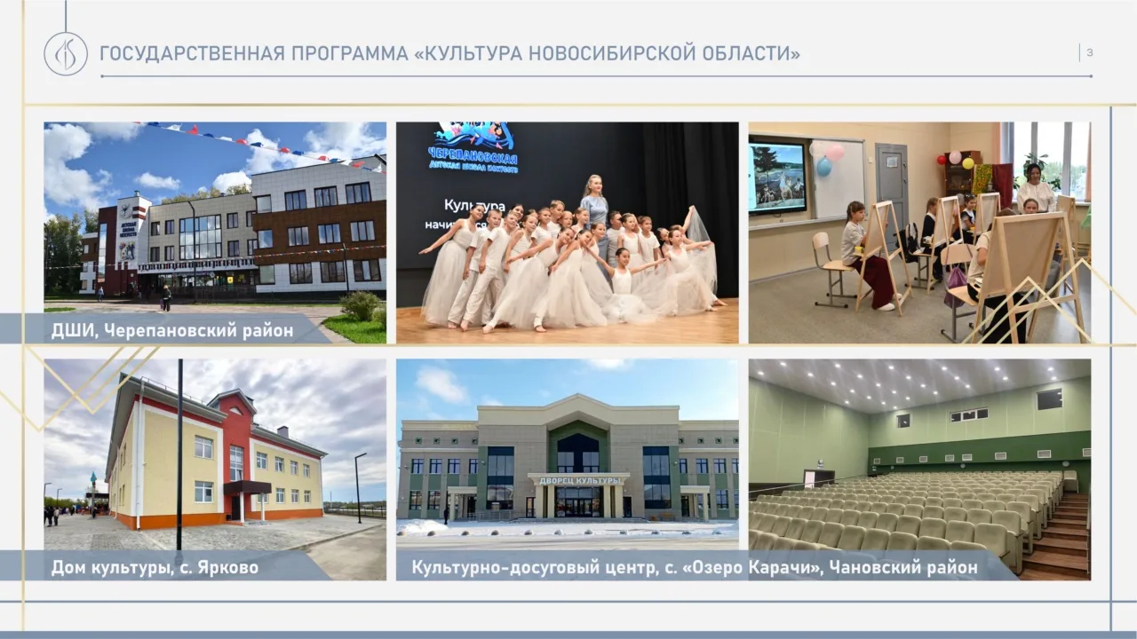 Среди наиболее крупных объектов, введенных в 2025 году в рамках госпрограммы «Культура Новосибирской области»: Детская школа искусств в Черепановском районе, Дом культуры в селе Ярково Новосибирского района, Культурно-доцуговый центр в поселке Озеро-Карачи. Уже построена и вскоре откроет свои двери для детей Детская музыкальная школа № 10 в Академгородке. Продолжается строительство Дома культуры с детской школой искусств в Чулыме.