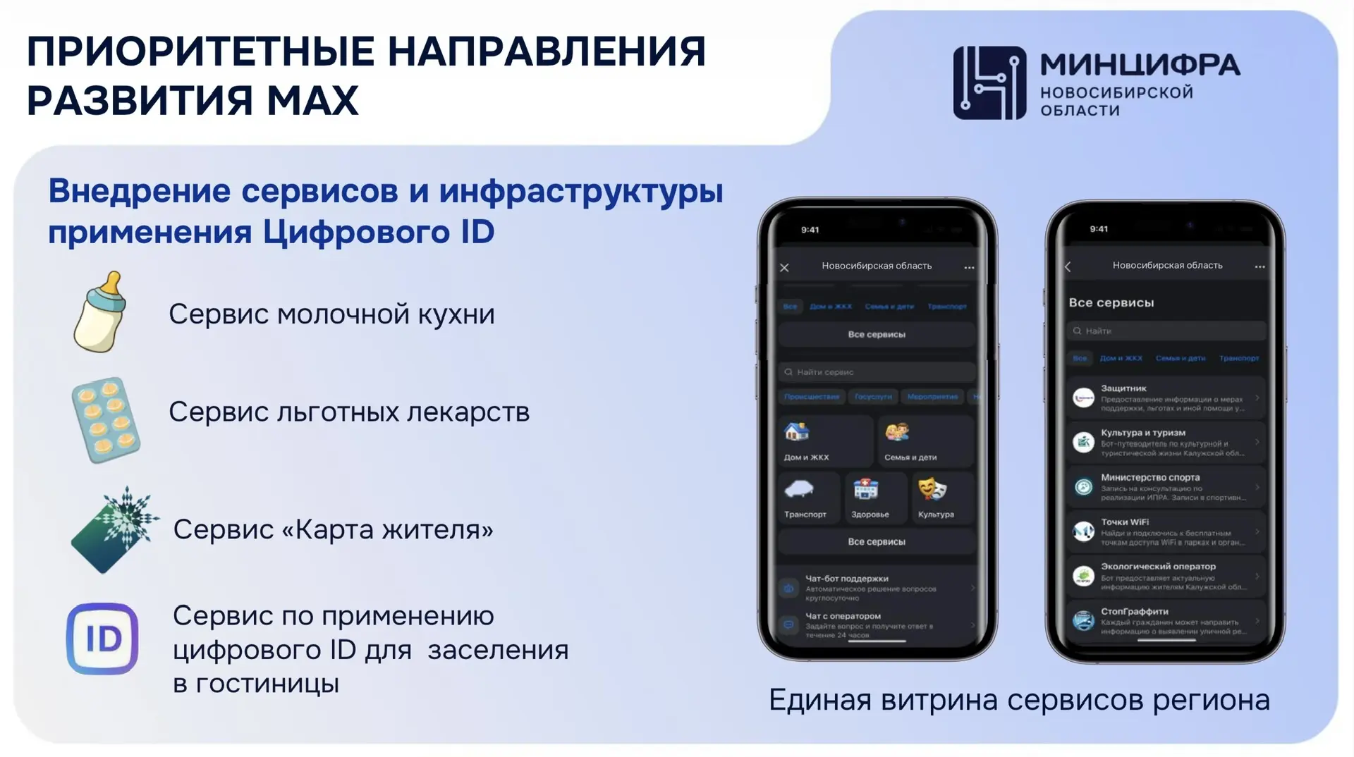 В этом году мы продолжим внедрение новых сервисов внутри МАХ – создание единой витрины сервисов региона, где можно легко найти любой интересующую услугу. Планируем запуск новых сервисов по направлениям молочной кухни, льготных лекарств, расширение применения на транспорте, а также запуск цифрового ID при заселении в гостиницы и приеме в МФЦ.