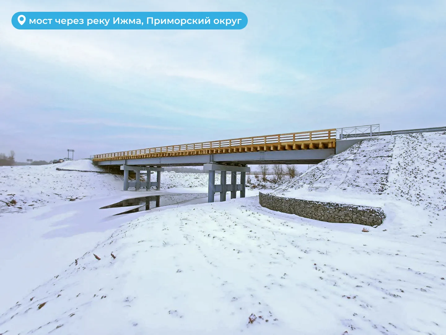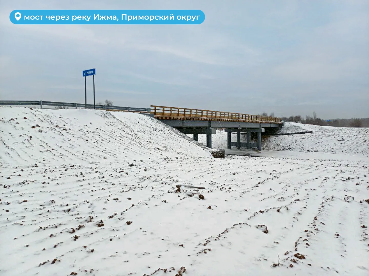 В Приморском округе завершили капитальный ремонт моста через реку Ижма. Работы проводили по президентскому нацпроекту «Инфраструктура для жизни».