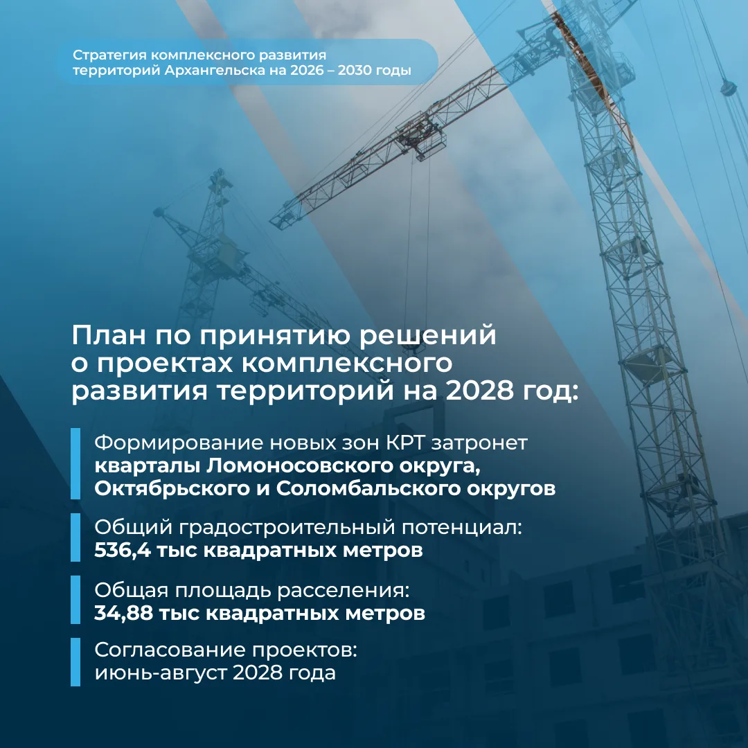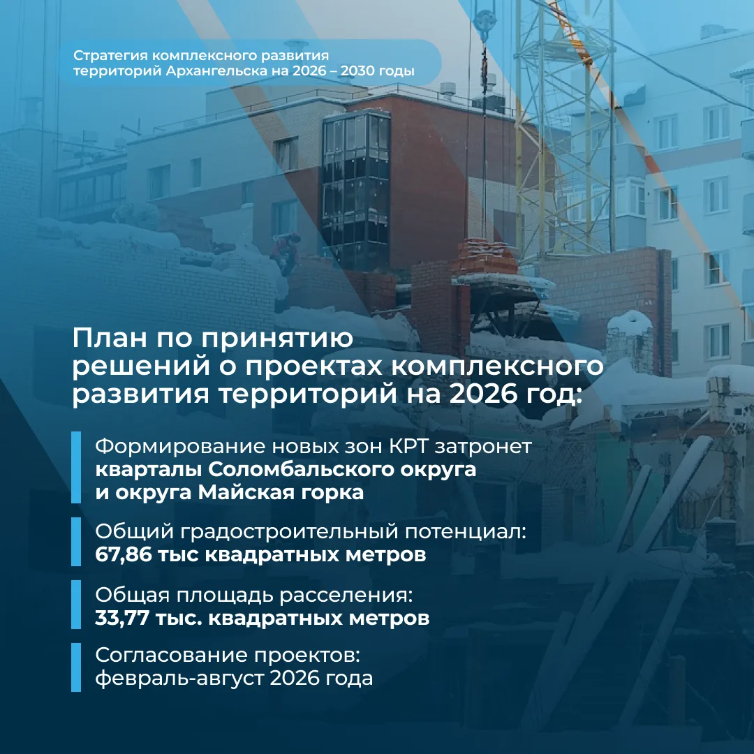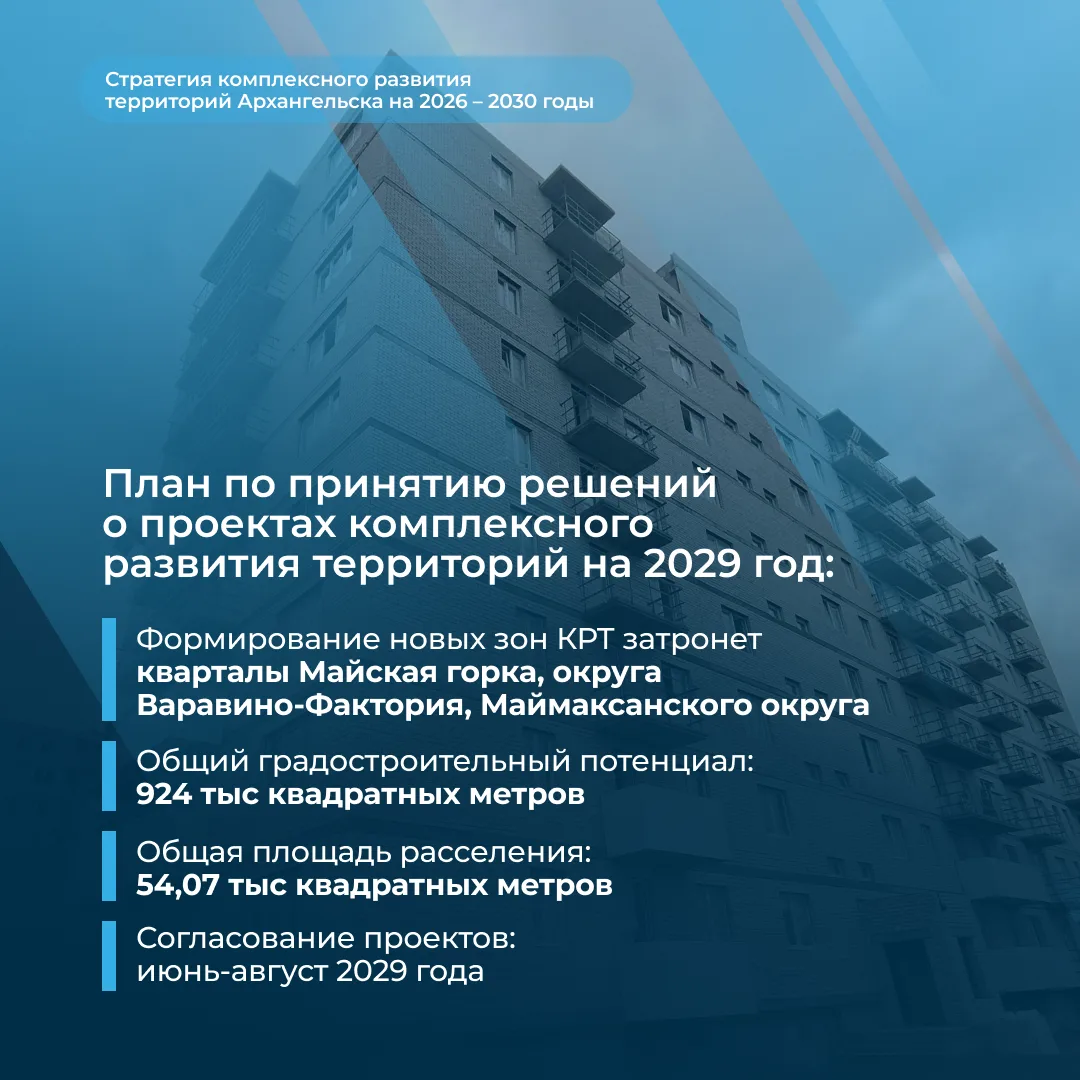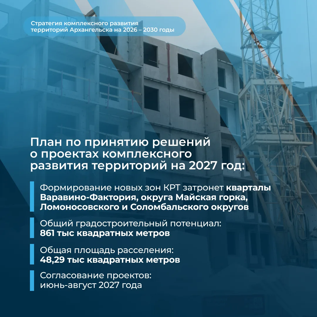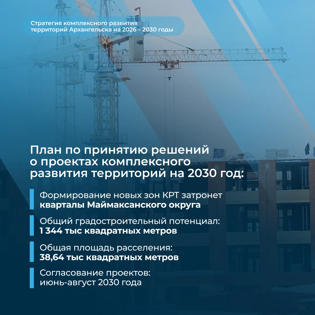Работа будет идти поэтапно, охватывая самые проблемные территории в разных частях города. В 2026-2028 годах в масштабный строительный фокус КРТ попадут ветхие кварталы Майской горки, Варавино-Фактории, Соломбалы, Ломоносовского и Октябрьского округов. Затем, в 2029–2030 годах, основные усилия направим на развитие Майской горки, Варавино-Фактории и Маймаксы – там потенциал преобразований особенно высокий.