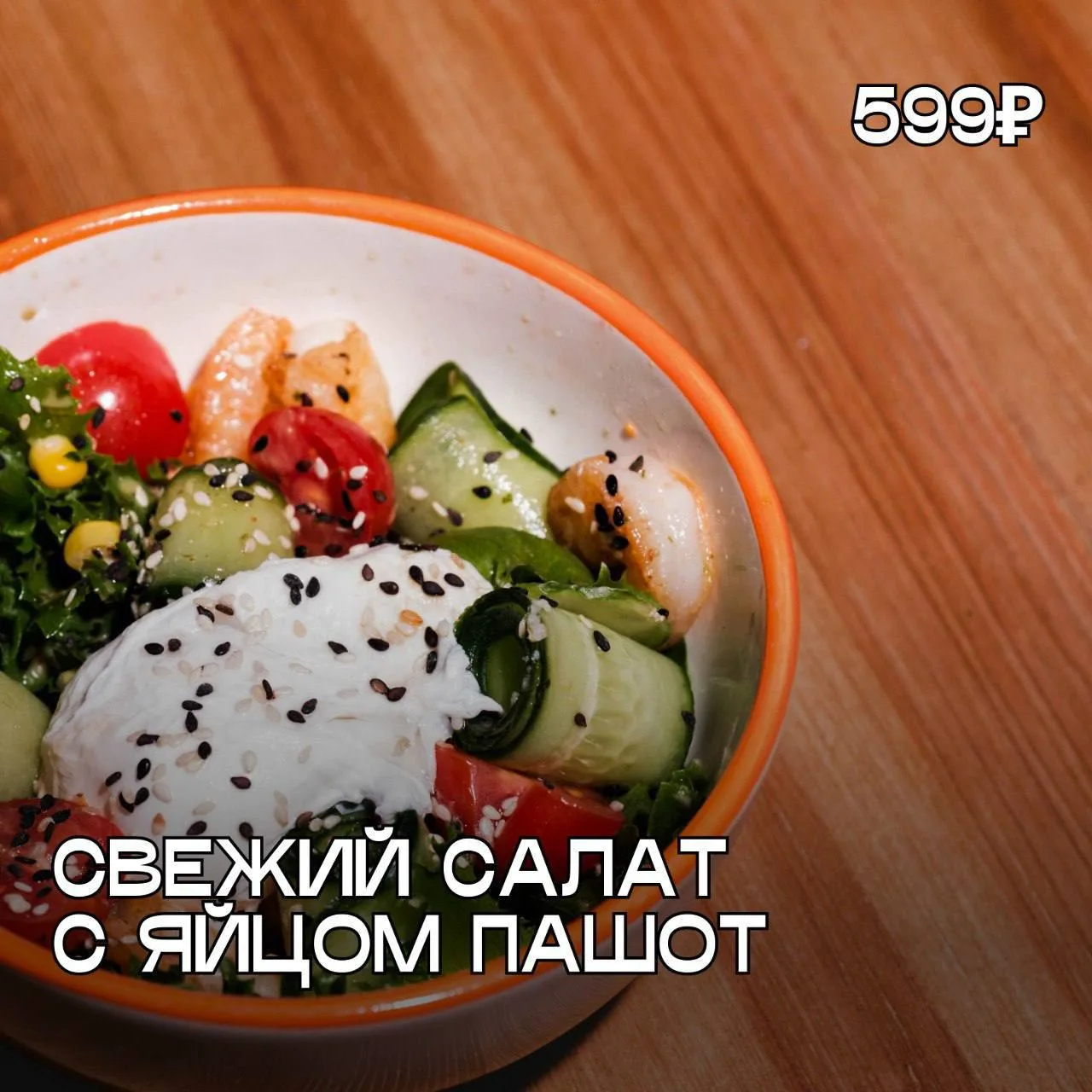 Свежий салат с яйцом пашот (599₽) — нежная текстура яйца в сочетании с сочными овощами. Просто, но со вкусом!