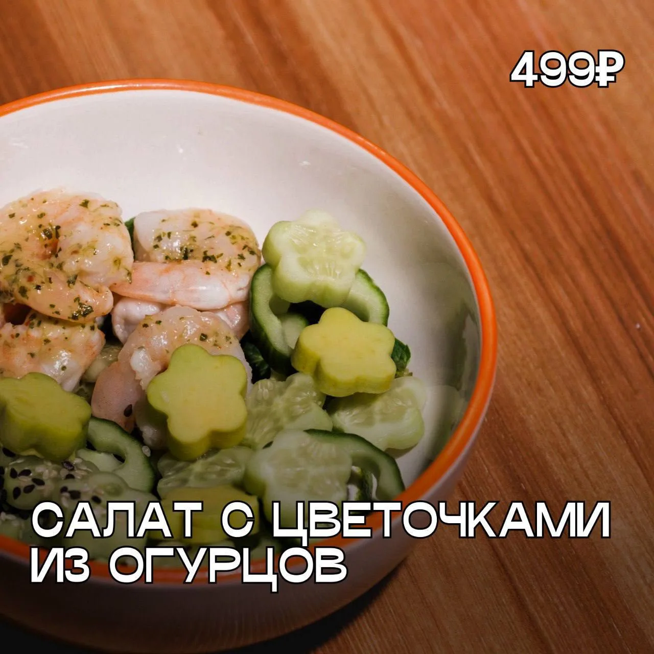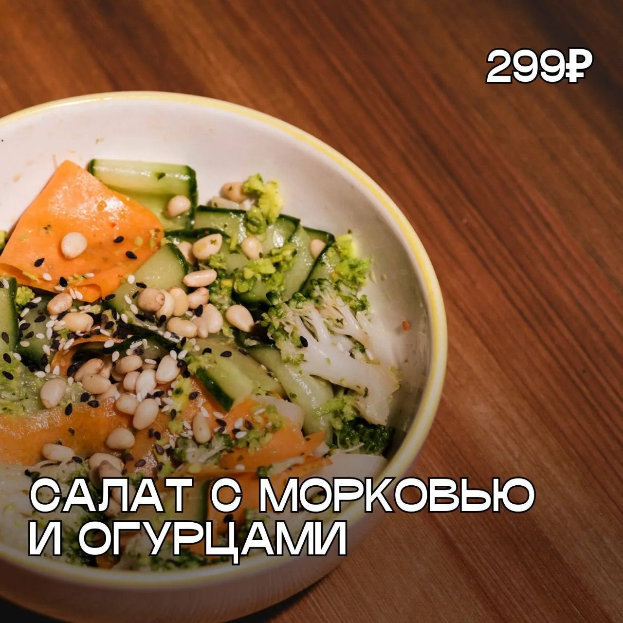 Салат с морковью и огурцами (299₽) — лёгкая закуска с хрустом свежих овощей. Идеальный старт для весеннего обеда.