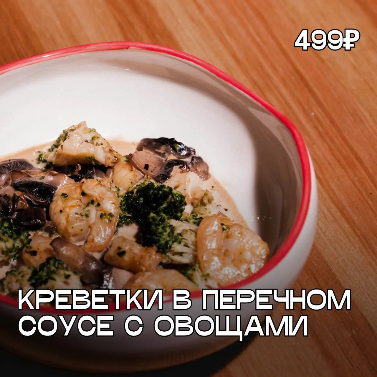 Креветки в перечном соусе с овощами (499₽) — пикантное блюдо с азиатским акцентом. Острота перечного соуса и сладость овощей создают гармоничный дуэт.