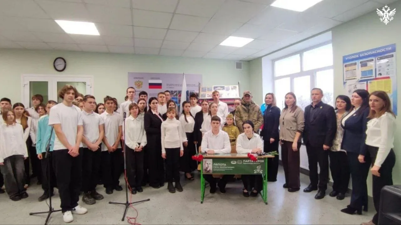 В Новотроицкой школе №1 парту открыли в честь Героя Советского Союза Степана Константиновича Ляпоты. Он командовал ротой, отличился в боях за освобождение Мелитополя и погиб в 1943 году. На мероприятии присутствовали депутат Херсонской Облдумы Ольга Осипенко, глава администрации Евгения Кузьменко и председатель местного Совета депутатов Алексей Козубский.