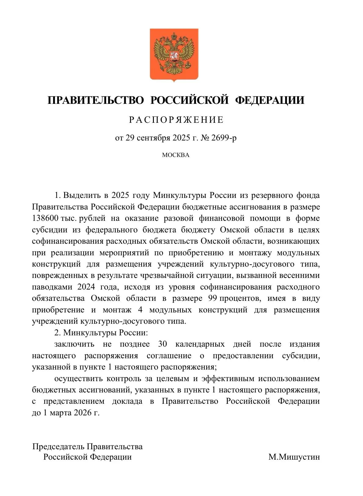Подписано распоряжение Правительства России о выделении Омской области средств на приобретение и монтаж модульных конструкций для размещения культурно-досуговых учреждений в Усть-Ишимском районе.