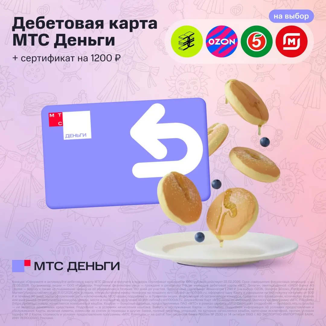 Оформите дебетовую карту 🏦МТС Деньги и получите сертификат 1️⃣2️⃣0️⃣0️⃣ 🅿️ на выбор: 🩷OZON, 🩷Золотое Яблоко🩷Пятёрочка или 🩷Магнит